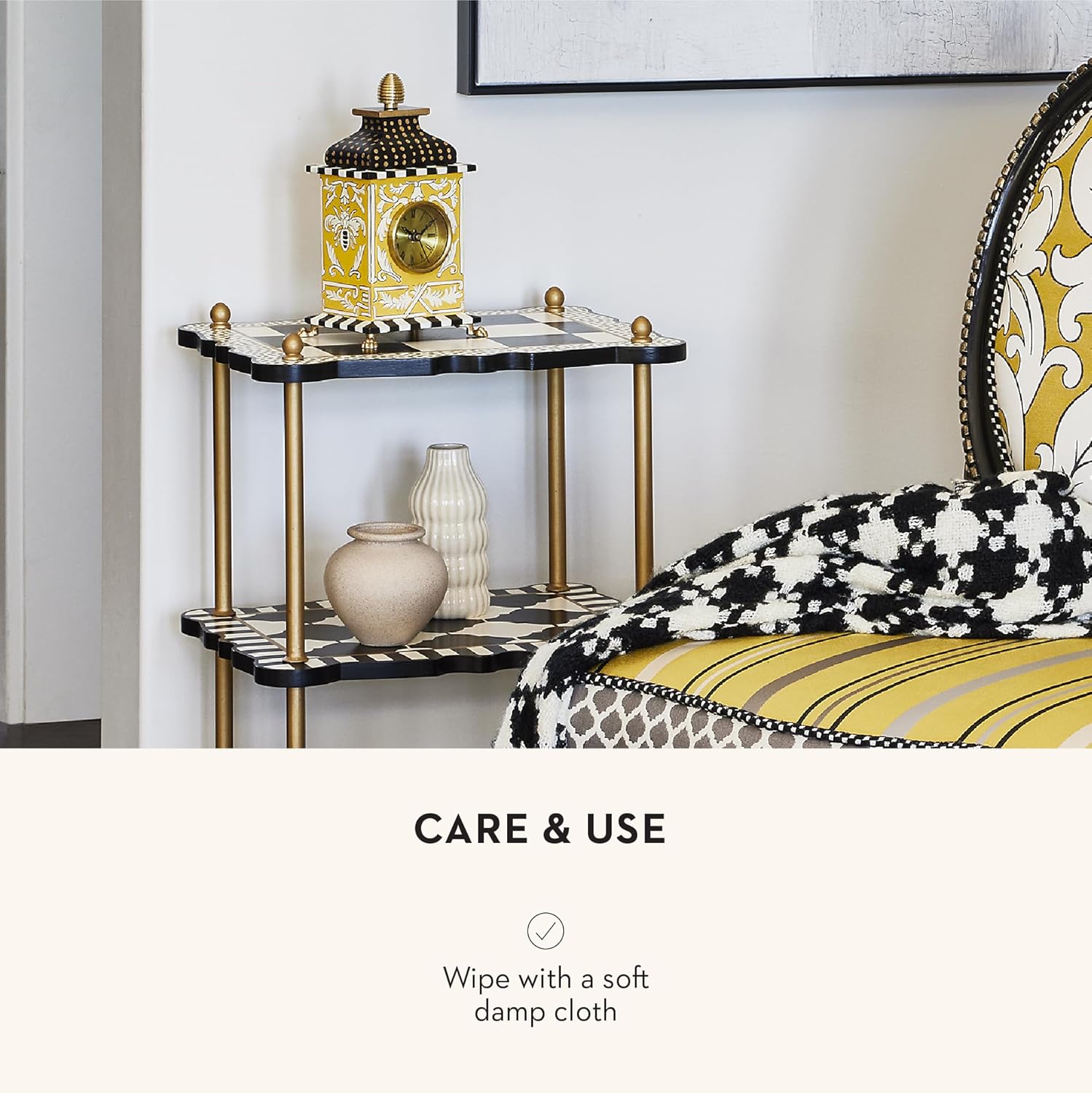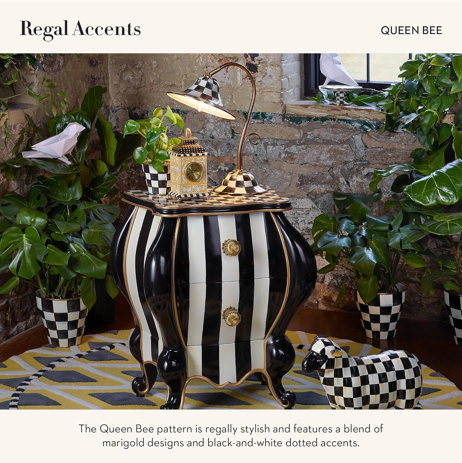 - ELEGANT HOME DECOR: The Queen Bee Desk Clock is an elegant piece of clock decor that will make everyone watch the time. This fancy standing clock features hand-painted wood, brass accents, and a yellow-and-white pattern and is topped with gold dots.