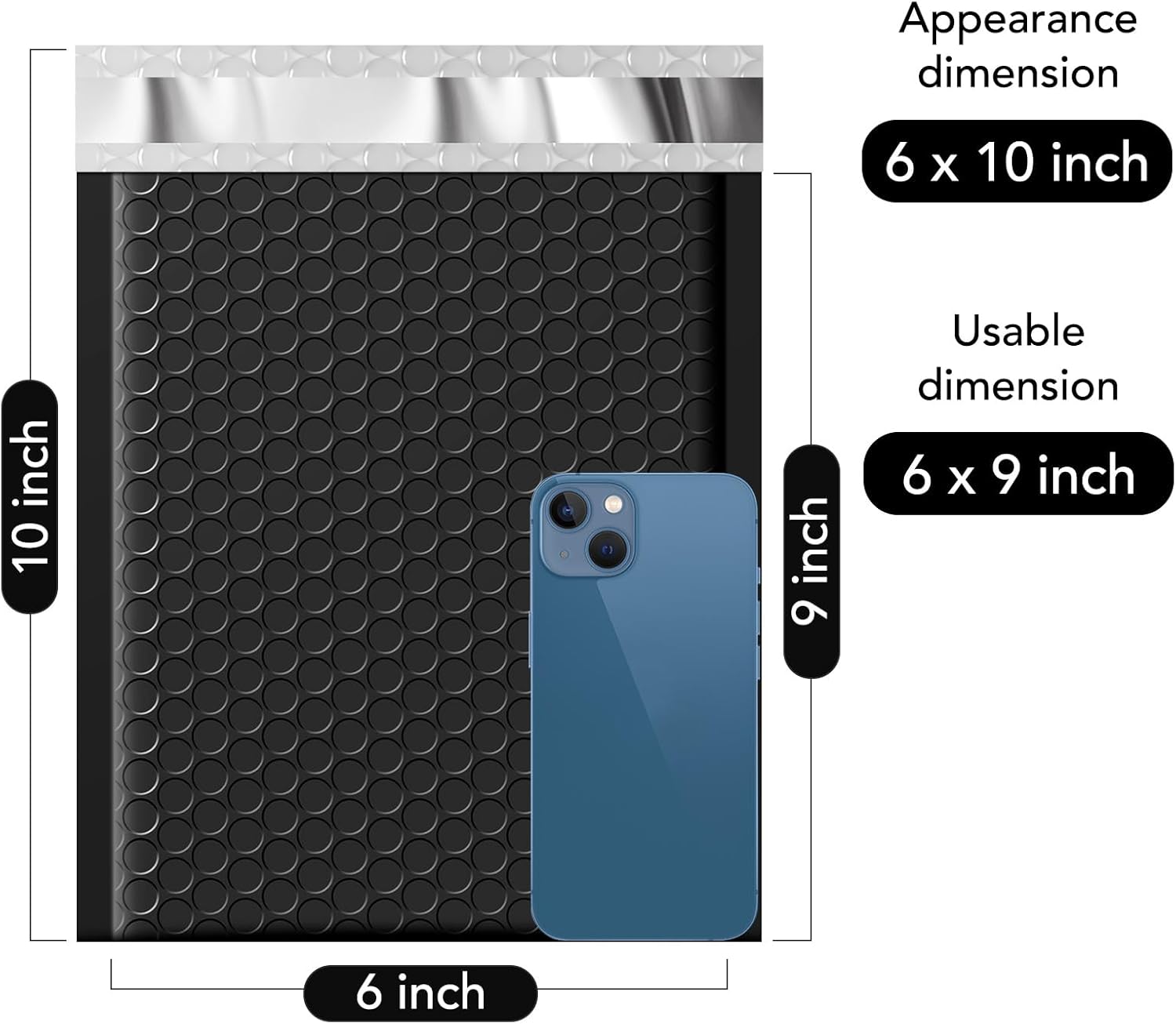 - Perfect Size Black Bubble Mailer: The poly bubble mailers outer size is 6x10 inch, while the inner size is 6x9 inch. It is very suitable for transporting jewelry, makeup, cards, phone case, lips, photos, handcraft and more.Great for small business packing,shipping gifts cushioning mailer.