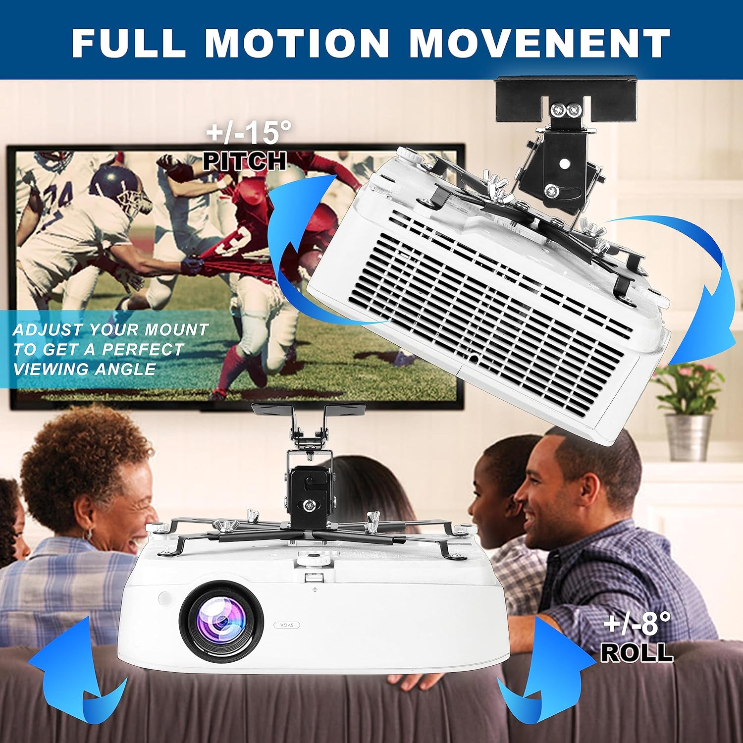 - EASY TO ADJUST: The ceiling mount for the projector is fully adjustable with +/- 8 degree tilt, and +/-15 degree swivel, hitting all the right viewing angles. The universal projector ceiling mount extending arms could reach from 8.85 inches to 12.44 inches