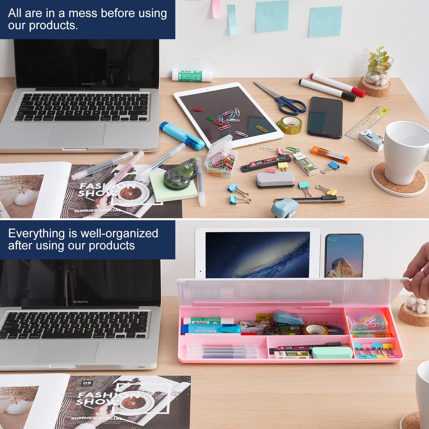 - HIDDEN STORAGE & PAD/MOBILE TRAY: De-clutter your desk by storing markers, magnetic eraser and other desktop accessories in the opening drawer or place markers on the accessory tray for quick access. And one more long tray on the top of the dry erase white board for your pad or mobile.