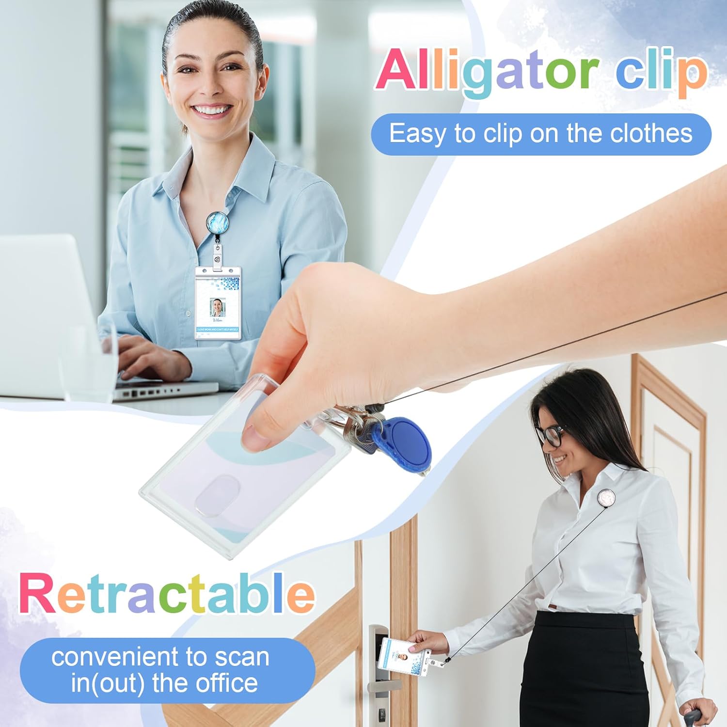 - Many Applications: these decorative badge holder reels and clip on ID card holders are stylish and practical accessories, they are quite suitable for office staff, teachers, volunteers, factory workers, employees, outdoor enthusiast and so on, can easily apply to belts, pockets, collar, purse straps, backpacks