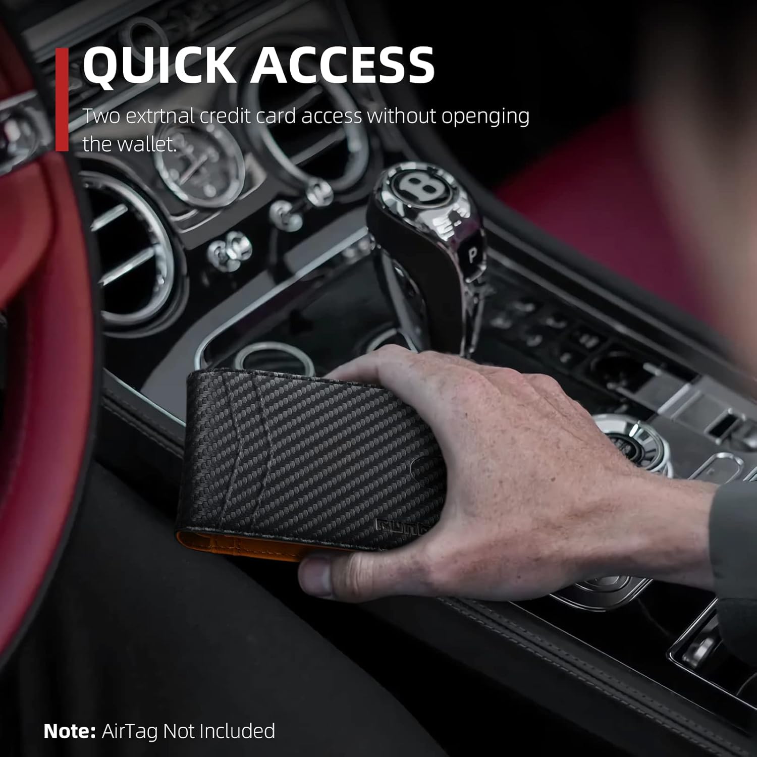 - NO MONEY CLIP DESIGN - Measuring 4" x 3.5", this slim men's wallet boasts a bill compartment that occupies less space than a metal money clip, effectively reducing bulk. It includes 11 card slots, featuring a quick-access slot on the front, 10 slots on the wallet sleeves, and 1 integrated AirTag pocket. (AirTag is not included)