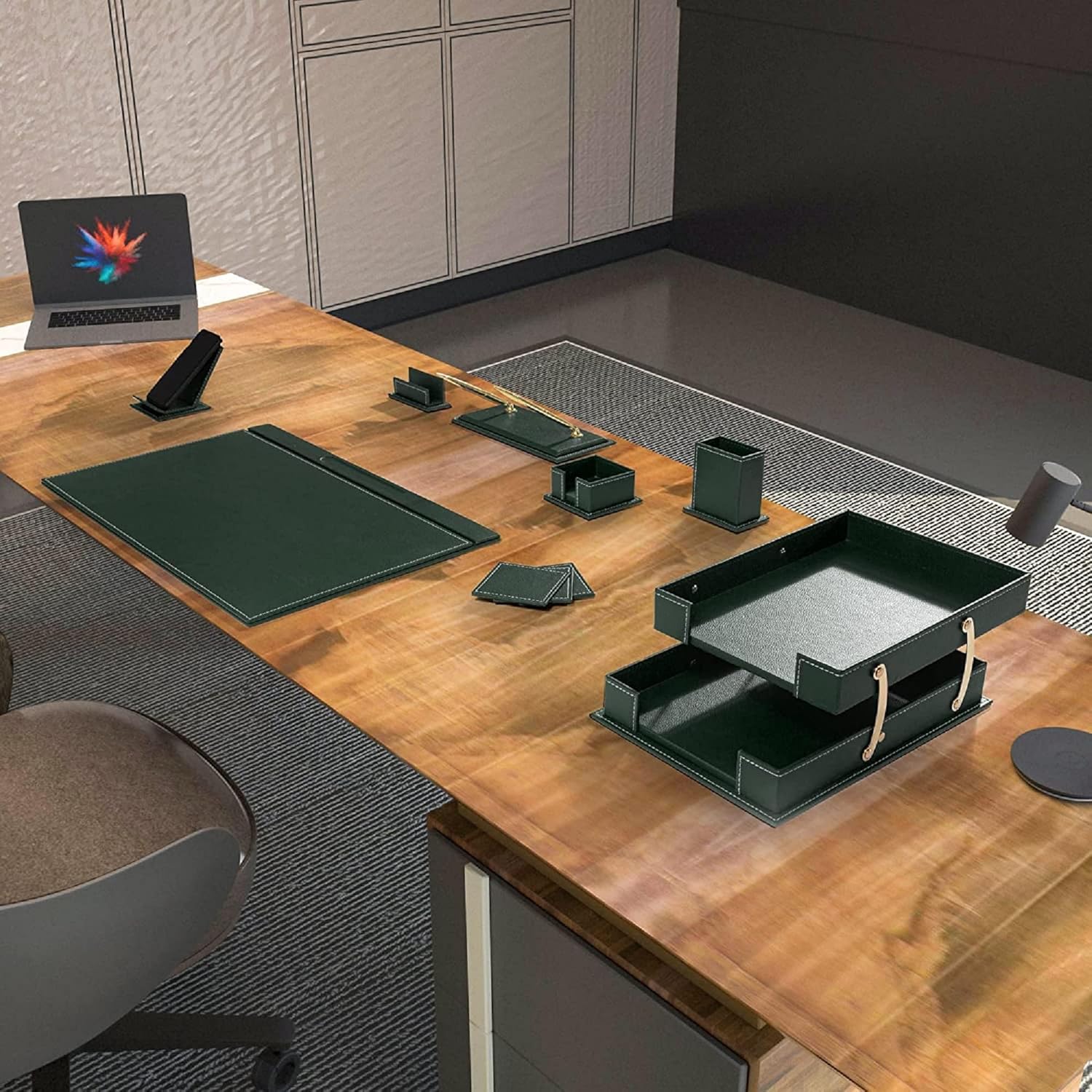 - We are offering you the opportunity to find the office accessories that you need, conceived by our finest leather artisans. Made with authentic leather and in a unique palette of colors, you will definitely add a distinct touch of class to your office décor. Our leather office sets are also well coveted among professionals who use them in conference or meeting rooms.