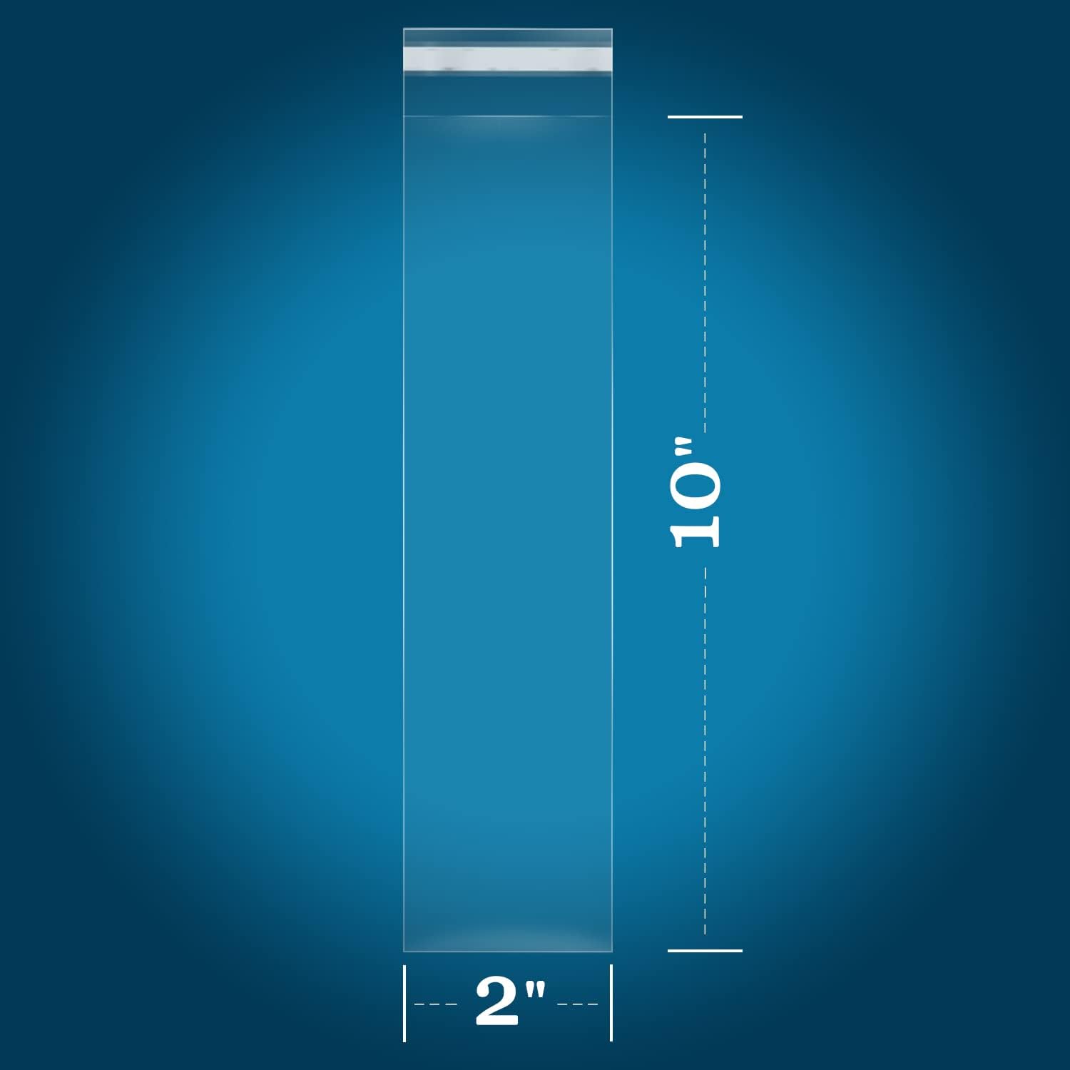 - [SPECIFICATION]: 200 PCS - 2" x 10"(Excludes Glue Flap) Resealable Cellophane Style Bags - Self Sealing. 1.4 Mil Thickness.