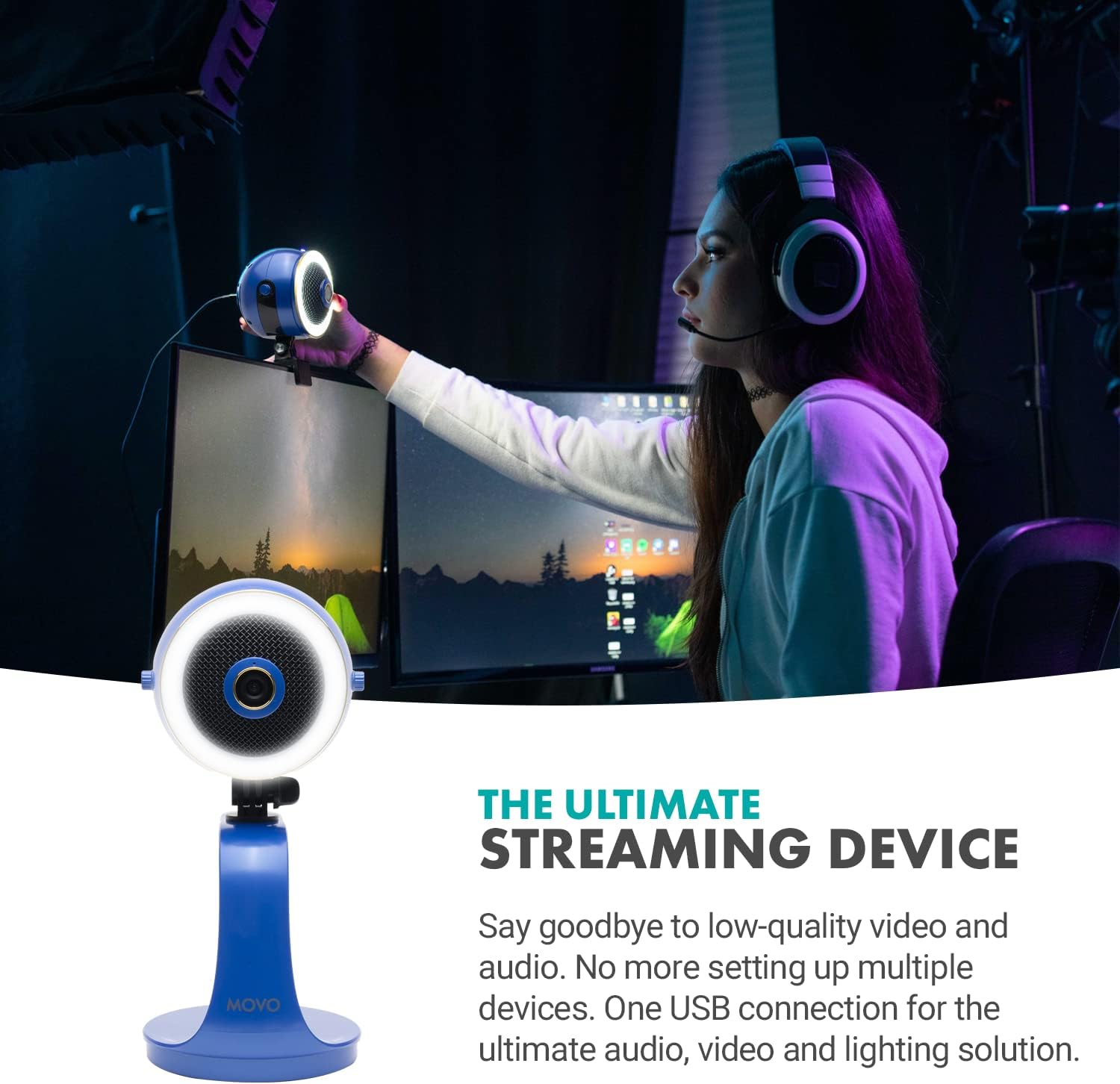 Movo WebMic HD Pro All-in-One Webcam with Mic and Ring Light in Royal Blue- 1080p HD Camera, Pro Cardioid Condenser Microphone, LED Ring Light - HD Webcam for Streaming, Video Calls, Recording, Gaming