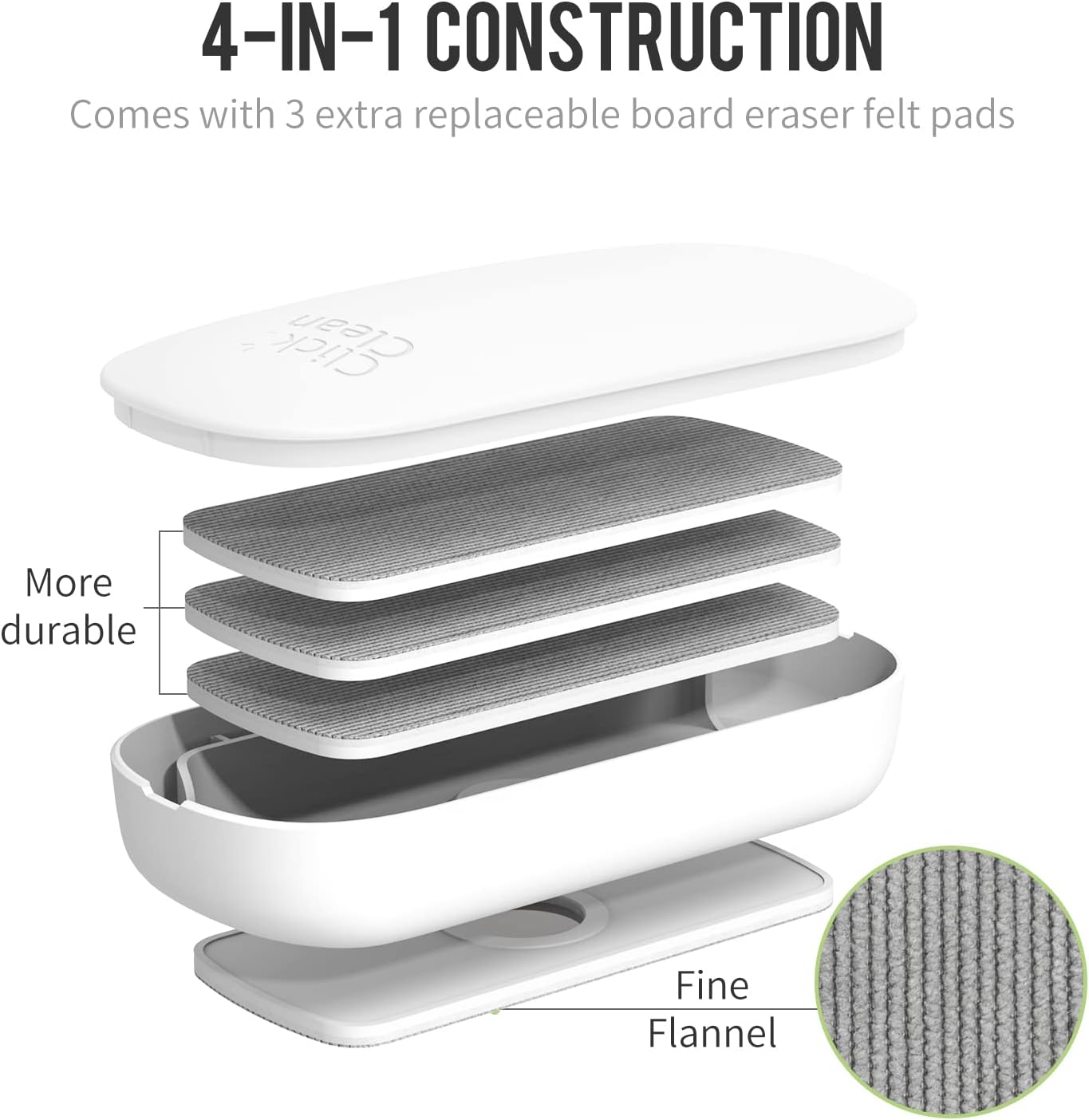 CLICK CLEAN Replaceable Dry Erase Board Eraser, 4-in-1 Magnetic Whiteboard Eraser with 3 Replaceable Felt Pads, Free 3.4oz Whiteboard Cleaner Included, Intended for Classroom, Home and Office