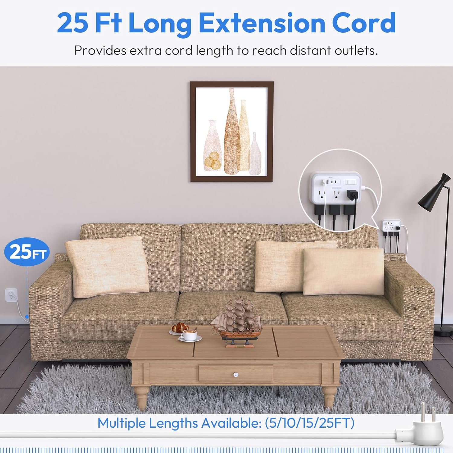 - 【 25 ft Extra Long Extension Cord Flat Plug 】The 25 ft power strip to the white extension cord provides extra outlets at optimal reach in home and office spaces. The right angle flat plug power strip is easier for cable management when plugged into the wall or behind furniture, which saves the space.