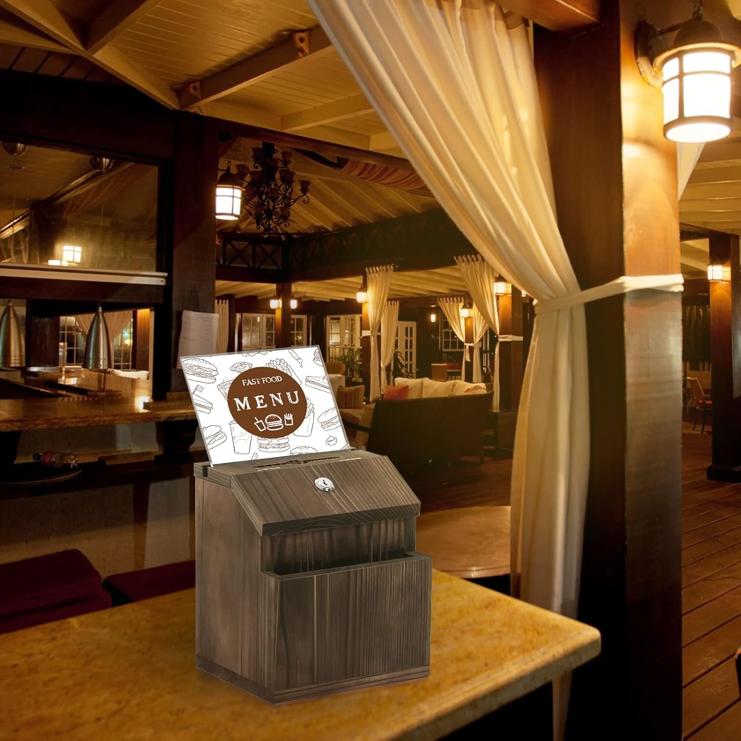 - DURABLE CONSTRUCTION:This suggestion box with lock is durably crafted of rustic wood.Can be mounted to a wall or positioned on any tabletop. Please note that there may be some wood shavings left on the surface of the goods. A simple wipe will easily clean it.