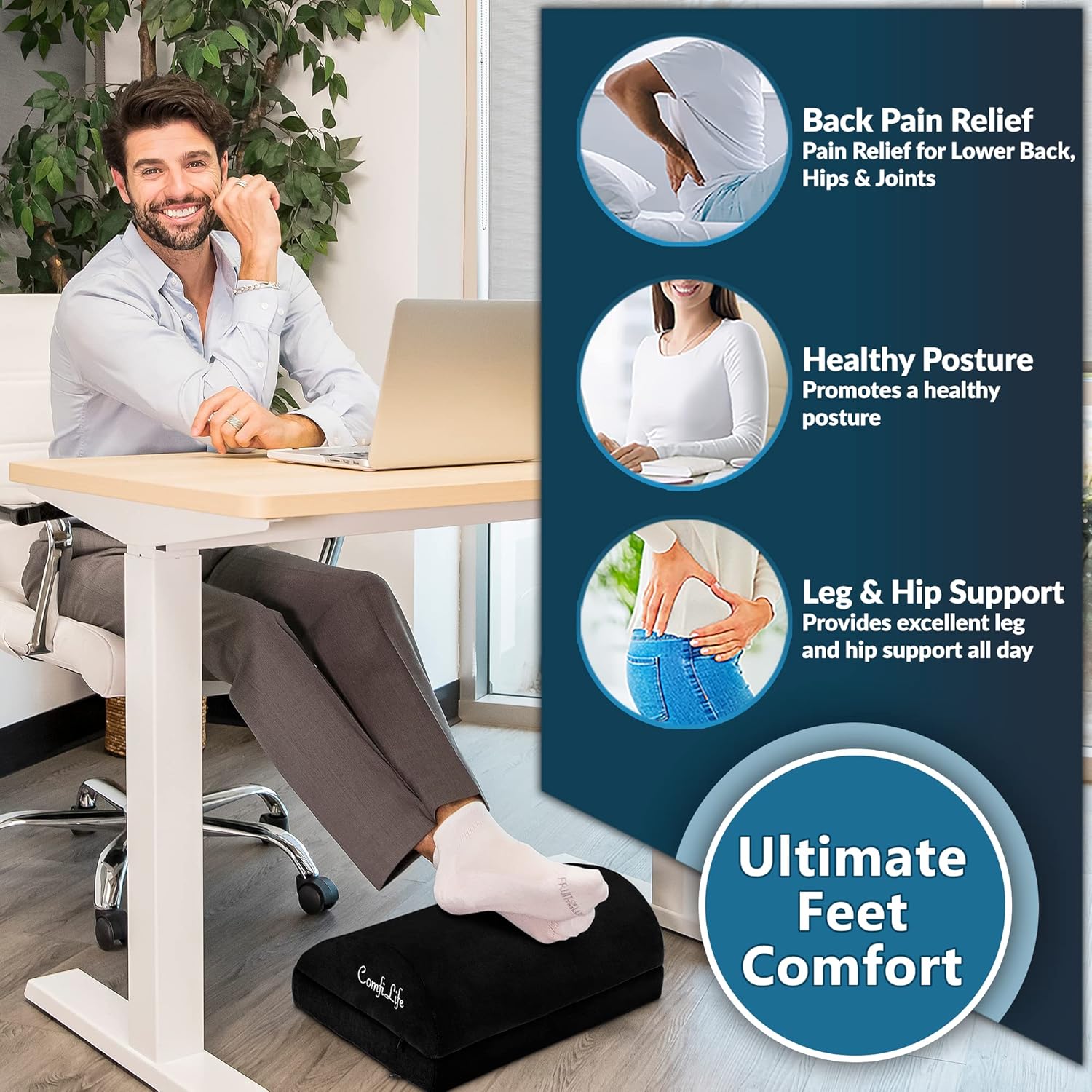 - Pain Relief for Back, Knees, Feet, Hips & Legs - Working a desk job or sitting at a computer can cause strain on the muscles, and over time you are bound to feel the effects on your body. ComfiLife Foot Rest will help reduce hip and back pain by easing pressure on your joints and encouraging circulation. Our footrest will also ensure natural foot placement while sitting, which will help improve blood flow to the legs and ease pain over time.