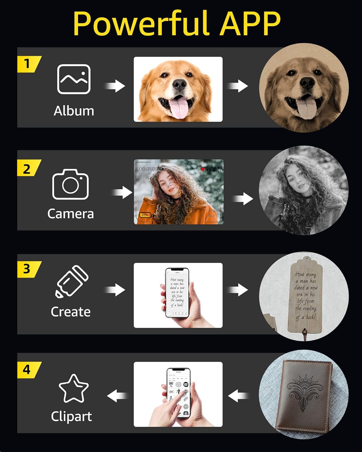 - Easy to Use: Plug and play laser engraving machine with innovative handle design for hand-held engraving. Small size for portability. Connects easily with smartphone or PC. Keep 11 cm(4.33 ") laser distance. File format supports JPG/PNG/G-code and more