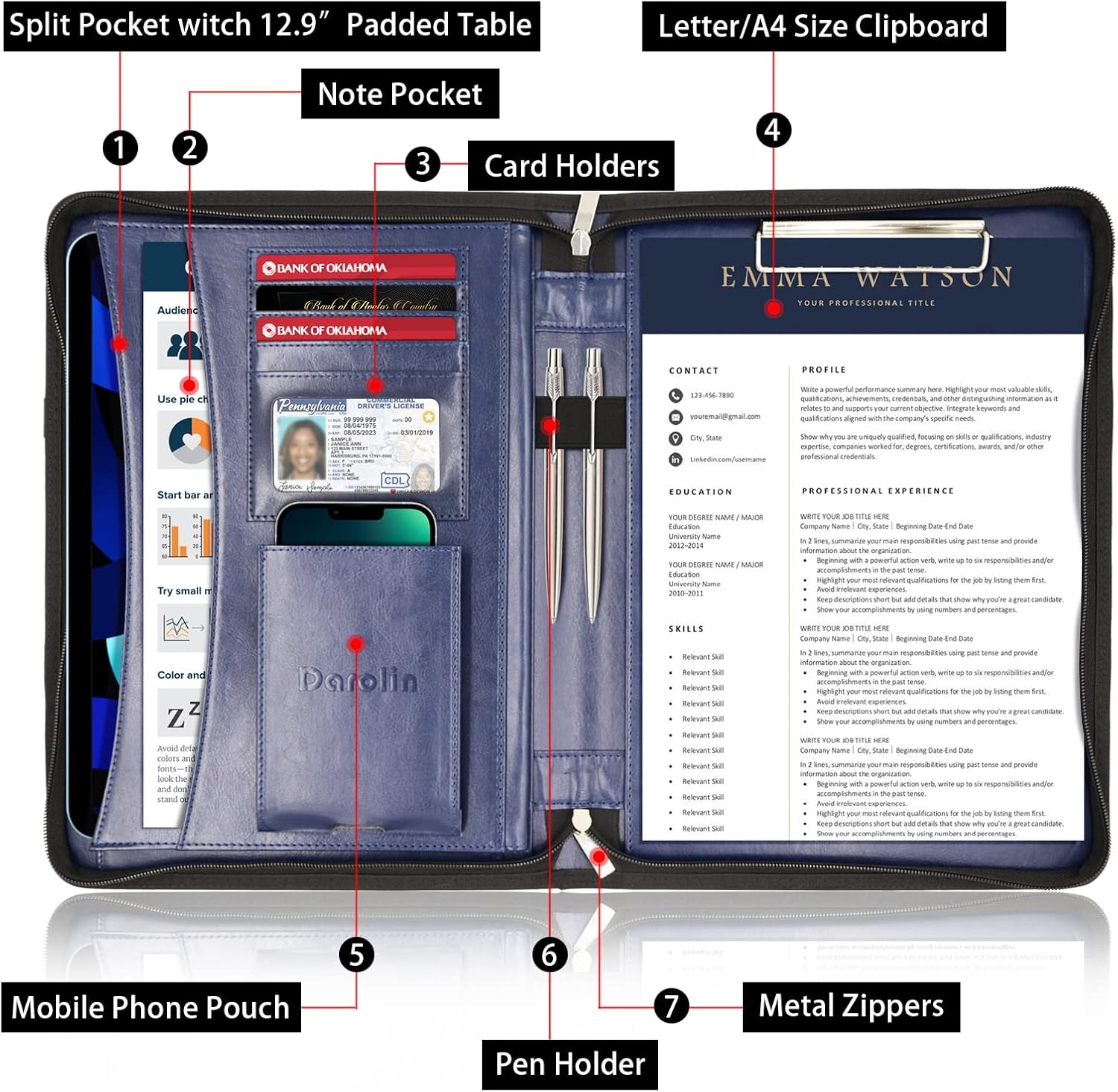 - [LARGE CAPACITY] Multiple Functions Portfolio include with a Clipboard, a Tablet Sleeve (up to 12.9-inch tablet), a Document Pocket, 5 Card Slots, a Mobile Phone Pouch with Charger Hole, and a Pencil Holder. Neat and Practical Organized All Your Stuff. This super business binder padfolio is big enough to safely store what you need yet is compact, stylish & travel-friendly.