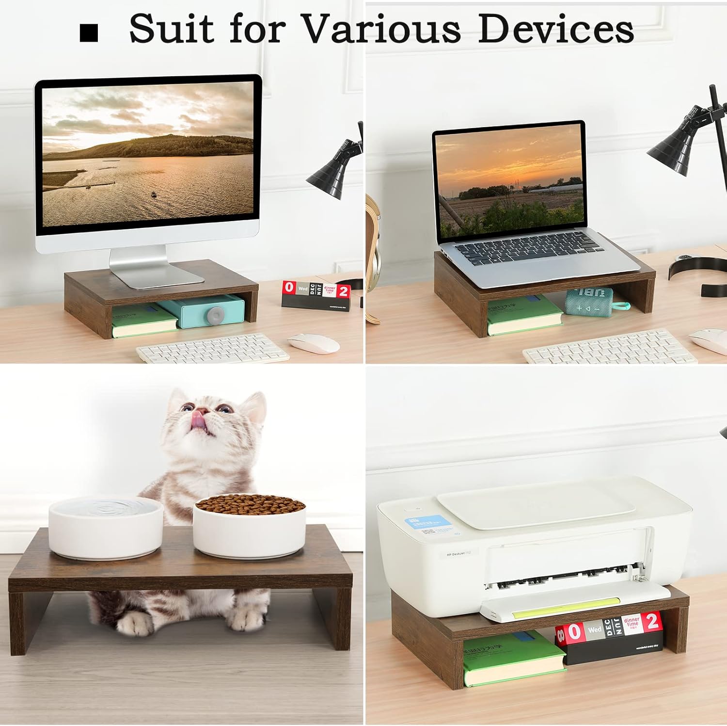 - 【2 Height Adjustable】 [3 3/8’’ & 6 3/4’’] Ergonomic design. When used side by side, the height is 3 3/8’’, which can place two monitors. When stacked up and down,be a 2 tier monitor riser which height is 6 3/4’’, and it is fixed with wooden pins avoid shaking.