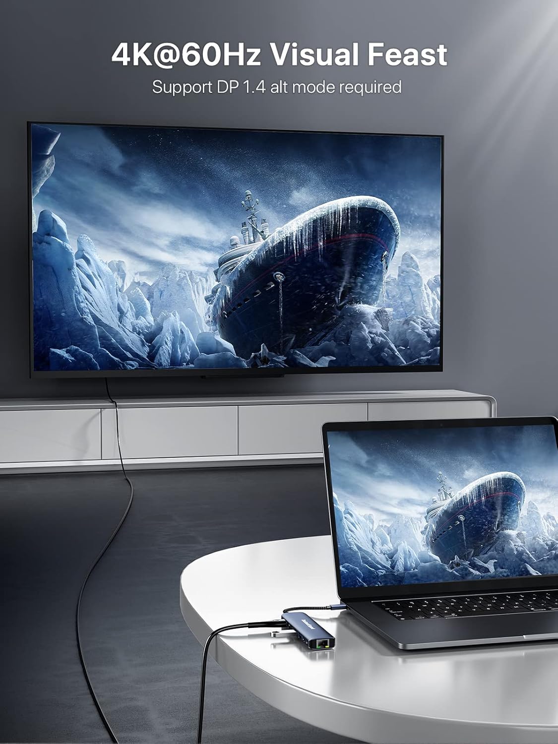 - 【4K 60HZ HDMI】USB-C to hdmi hub can mirror or extend your screen to your monitor, HDTV or projector, and stream 4K 60Hz HDMI video output (ONLY DP 1.4 Alt mode can get 4K@60Hz). The usb c hub hdmi can transfer UHD movies, games, presentations etc., bringing you visual feast.