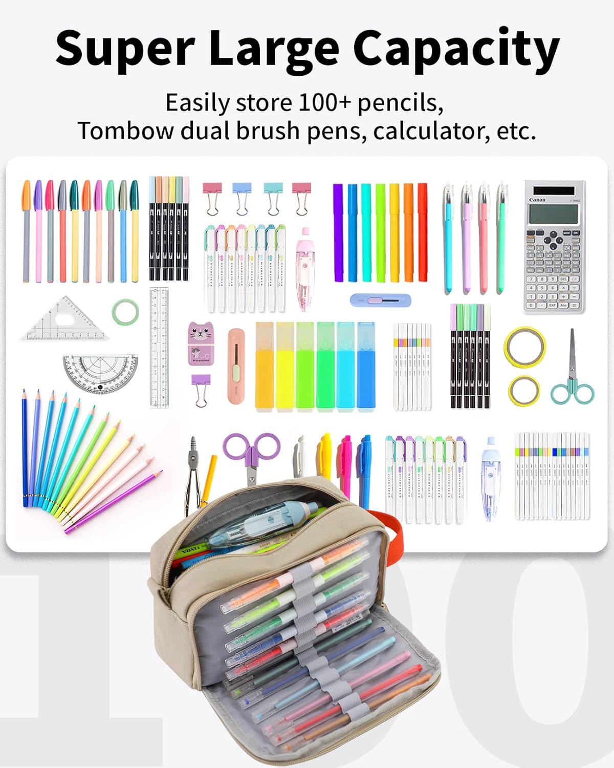 - Truly Large Capacity: Quite probably the biggest one you can get. Roomy storage, easily hold up to 100 pencils and supplies as scissors, calculator, rubber, even portable charger. Perfect size, fits +all the thing you need for daily work and study. Age of Application: 3 yrs+.