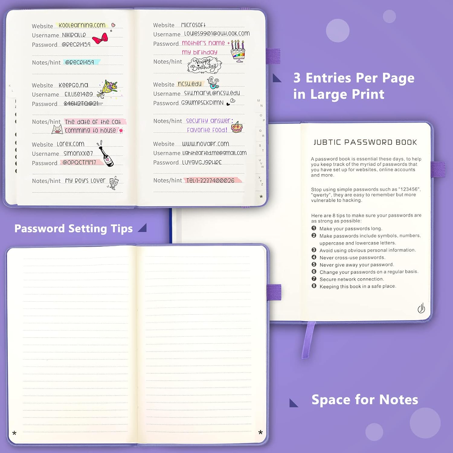 - UNIQUE DESIGN: Password Notebook with A-Z tabs to record & find your passwords fast. 3 entries per page with large print and extra space for notes and hints. easy to use, you may never need to change the password book again!