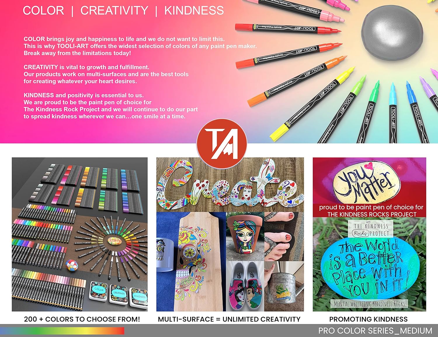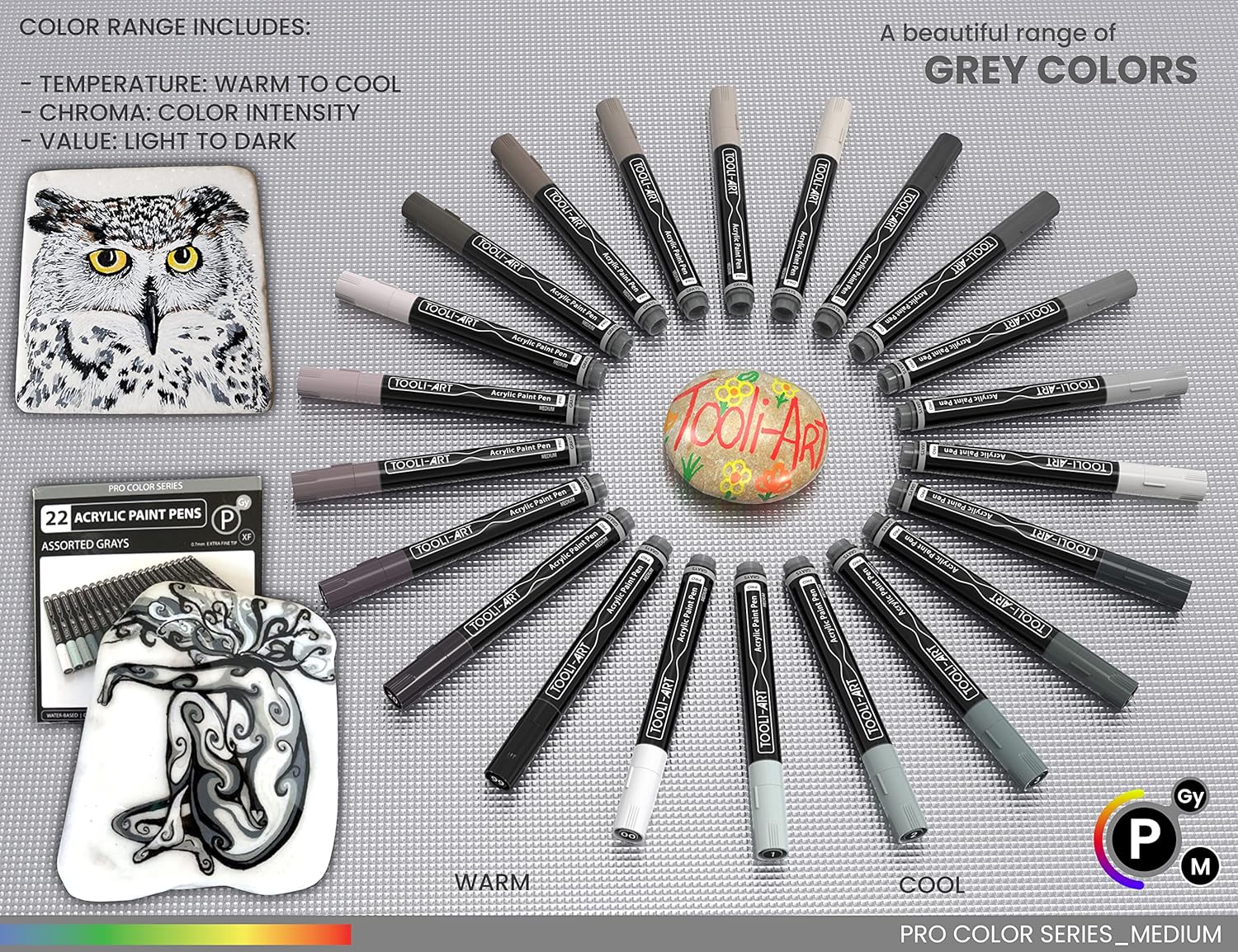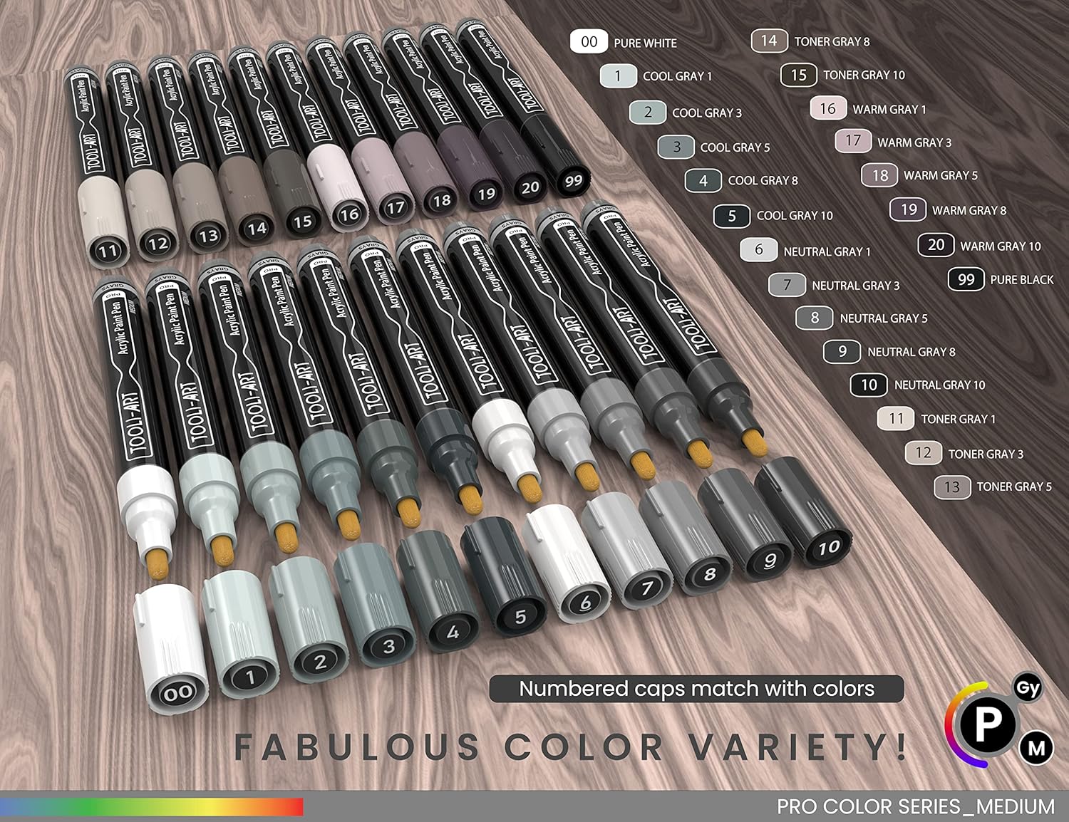 TOOLI-ART 22 Acrylic Paint Markers Paint Pens Pro Color Series Set 3mm Medium Tip for Rock Painting, Glass, Mugs, Wood, Metal, Glass Paint, Canvas, DIY. Non Toxic, Waterbased, Quick Drying (GRAYS)