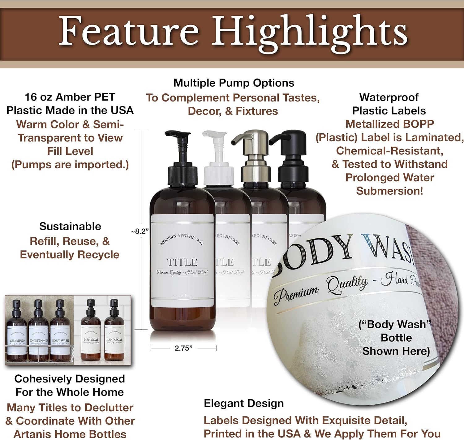 Amber PET Plastic Refillable Hand Sanitizer Pump Bottle Dispenser with White Plastic Pump, 16 oz with Waterproof Labels, Empty Reusable Container for Home, Kitchen, Bathroom, Office, Business