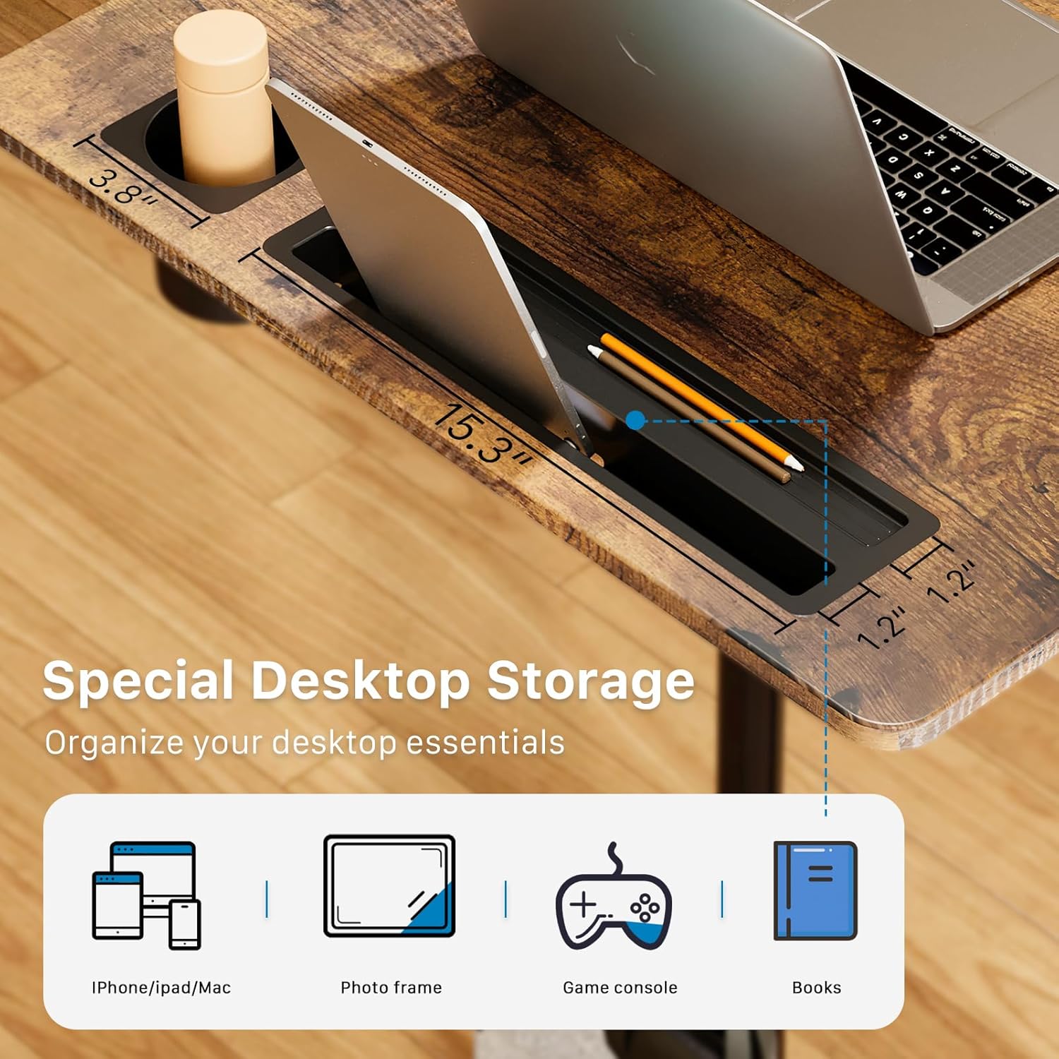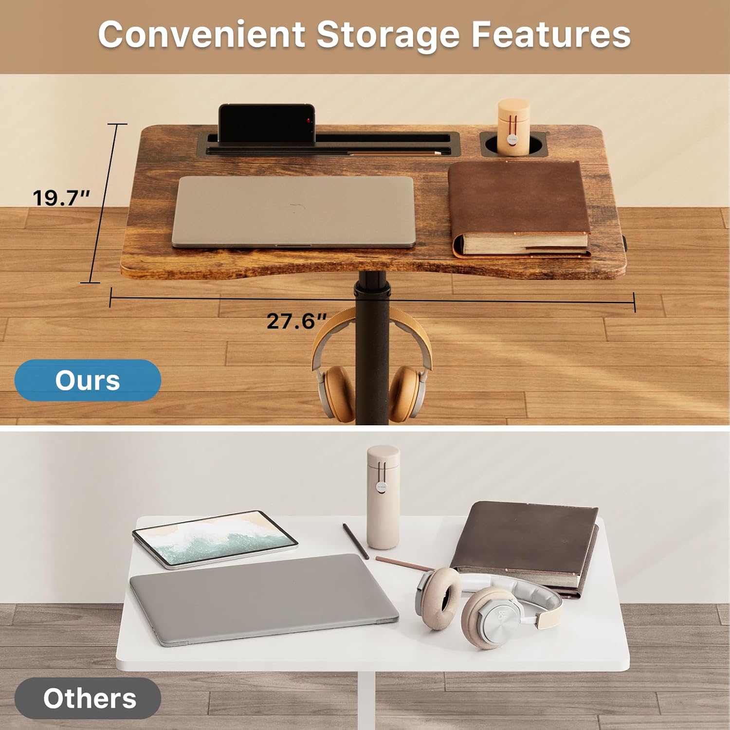 - Multipurpose Mobile Workstation: The rolling desk is equipped with cup holder and dedicated slots, it's a good way to contain your drink and office supplies. Meanwhile, Hook design makes it convenient to organize your headset or backpack