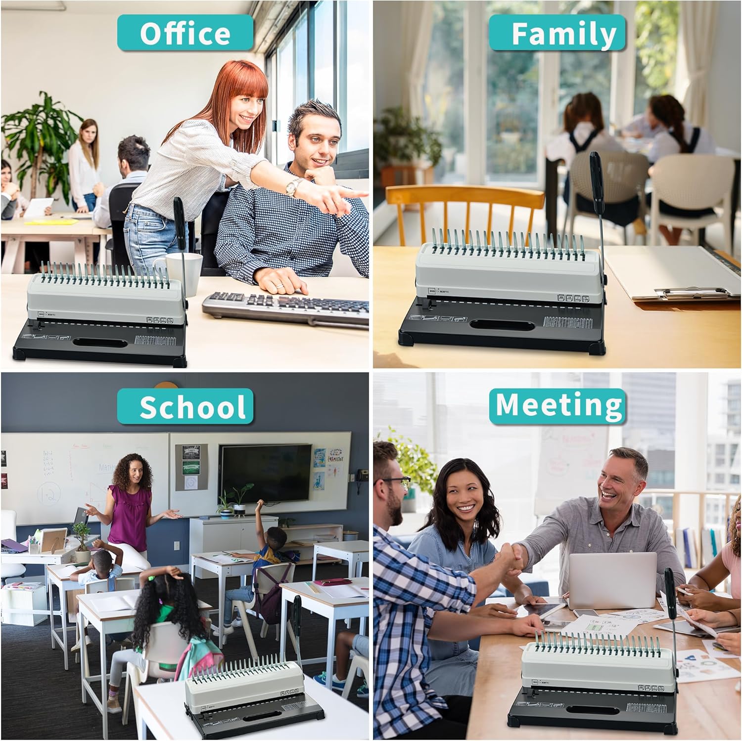 - 【Humanized Design】Our comb binding machine features advanced cutting blades and an ergonomically designed curved handle, allowing you to cut paper effortlessly with minimal force. The 19-hole punch is specifically designed for Letter-size paper but can also accommodate A5 size (15 holes) or other smaller sizes. This comb binding machine is engineered for consistency, ensuring long-term use and professional-quality bound documents.