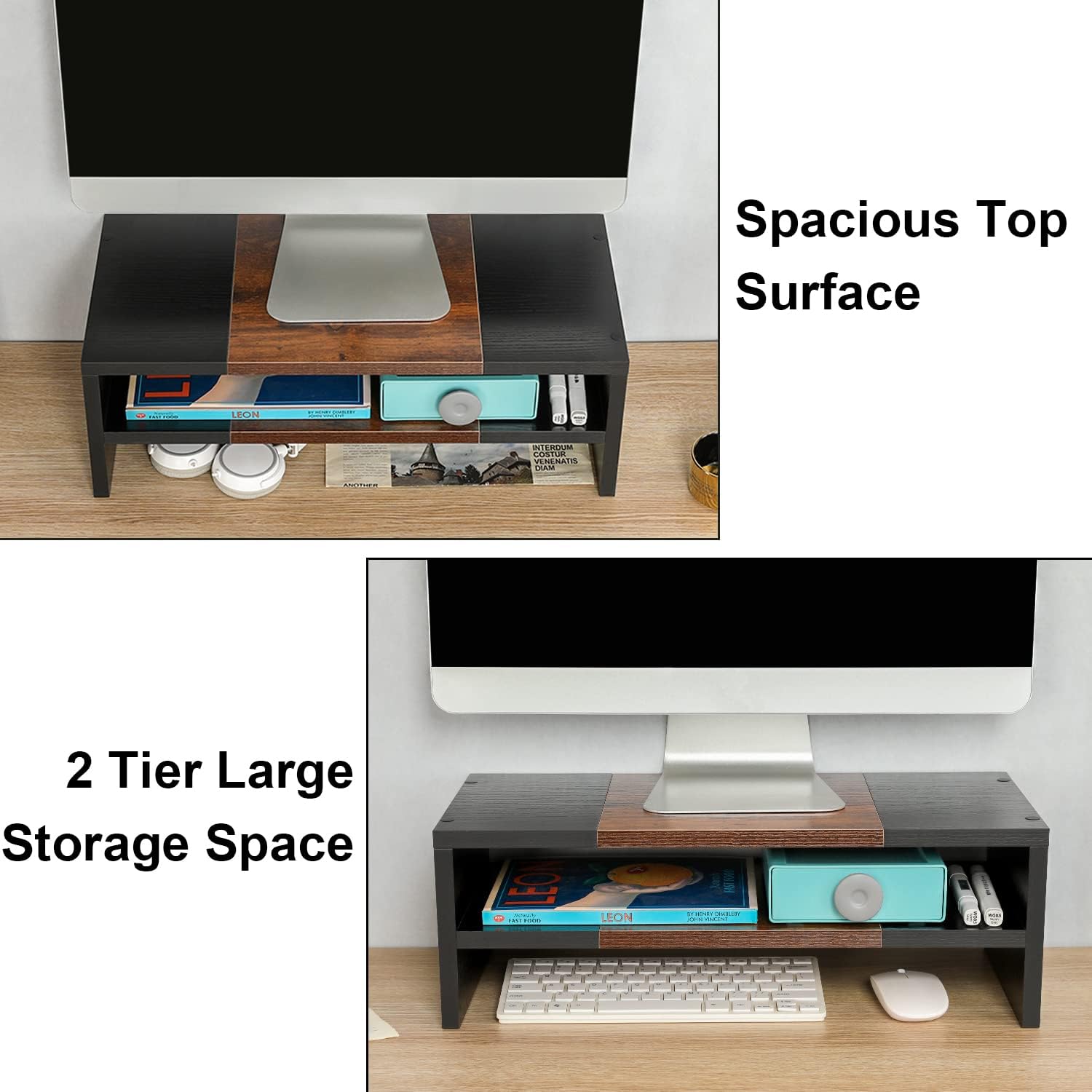 TEAMIX 2 Tiers Desktop Monitor Stand Riser 20 Inch Printer Stand with Storage Small TV Riser Laptop Wooden Desk Organizer Shelf Bookshelf (Black+Brown, 2 tiers)