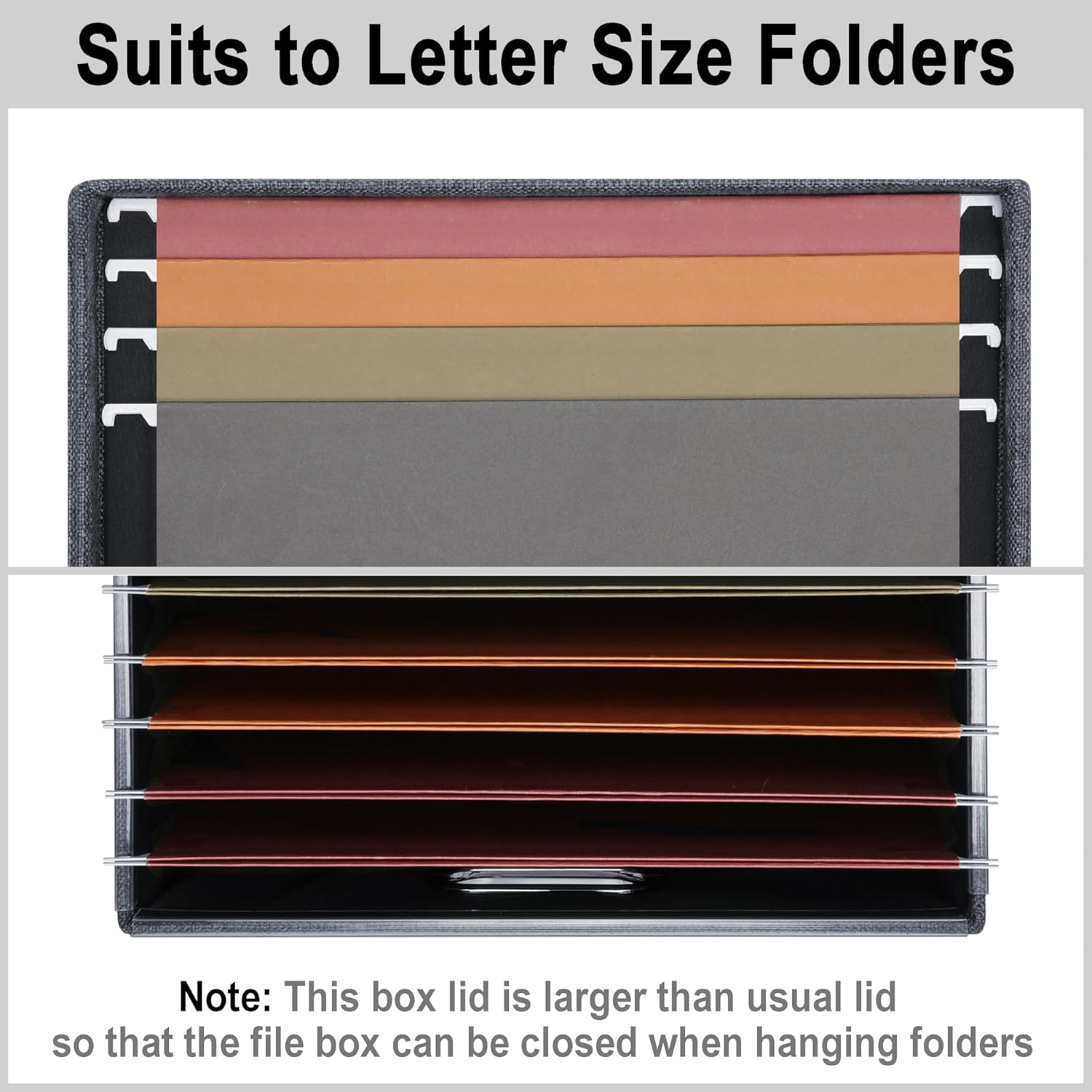 - Capacity for Letter Size Hanging Files : Measures 12.2 x 9.8 x 11 inches, our decorative file storage boxes with lids a great size to organize all your hanging Letter folders or other office things like paperworks, letters, folders, files. You also can use this desktop file storage box portable to store books, toys, clothing,home repair tools etc. This office file storage box small keeps you away from a messy desk!