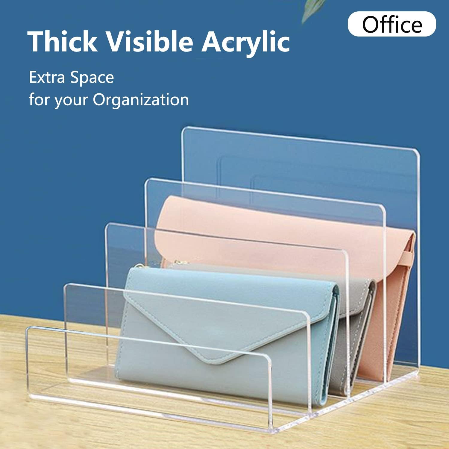 - Acrylic File Holder: Clear desk file organizer for home and office – desktop storage solution for letter, notebook, purse, binder, magazine and more – 4 sections – clear.