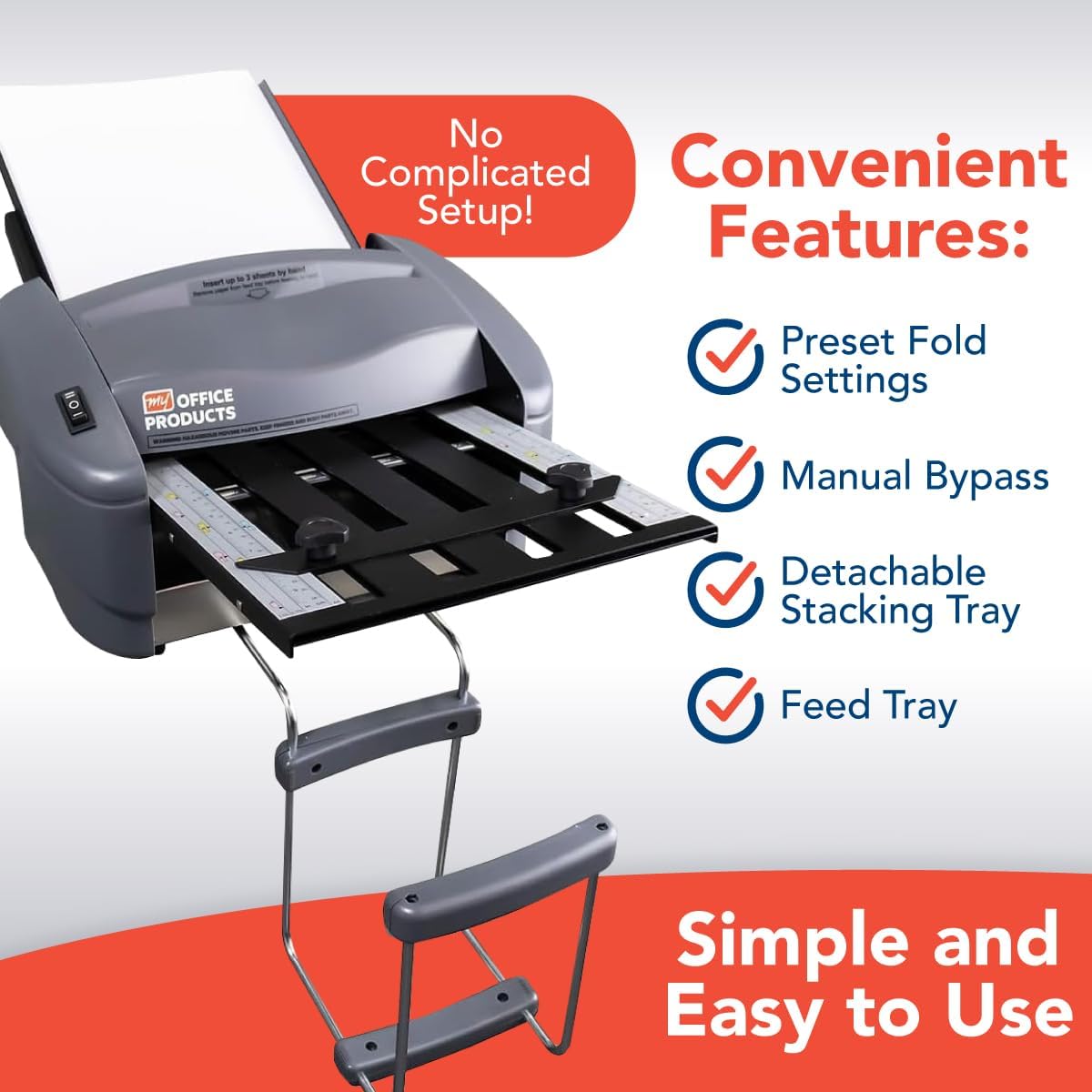 - {Built for convenience} Simply place your letter folder at your workstation, load up to 50 sheets* in the feed tray, and the stacking tray will hold your folded document collection when they’re complete