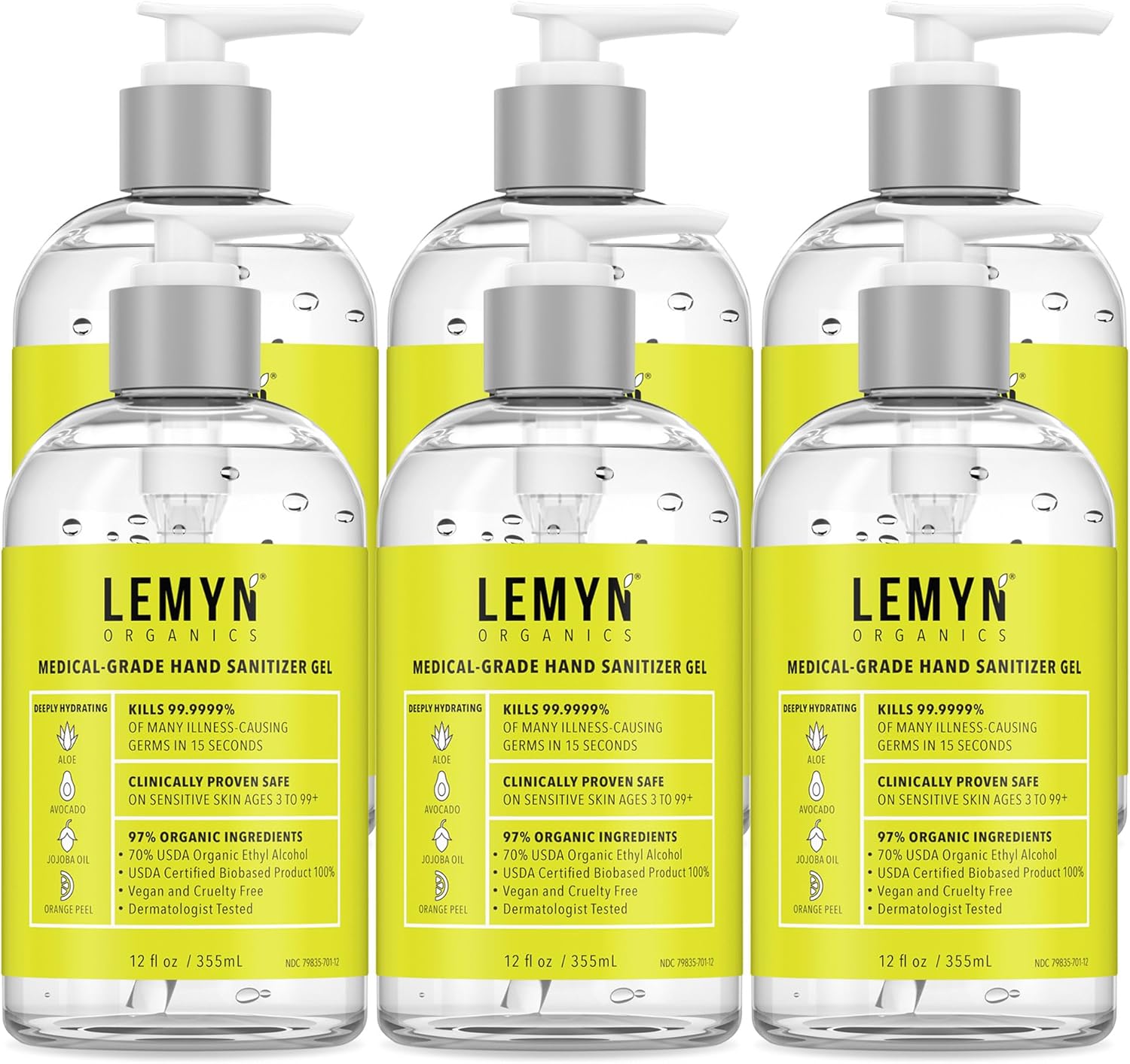 Medical‑Grade Hand Sanitizer Gel – 97 % Organic | 70 % USP Ethyl Alcohol | Moisturizing Aloe + Hyaluronic Acid | Freshly Made in USA | 12oz Bottle with Pump (PACK OF 6)