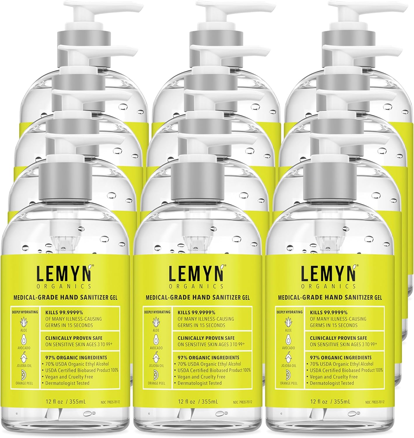 Medical Grade Hand Sanitizer Gel - 97% ORGANIC - 12 FL.OZ. (PACK OF 12)