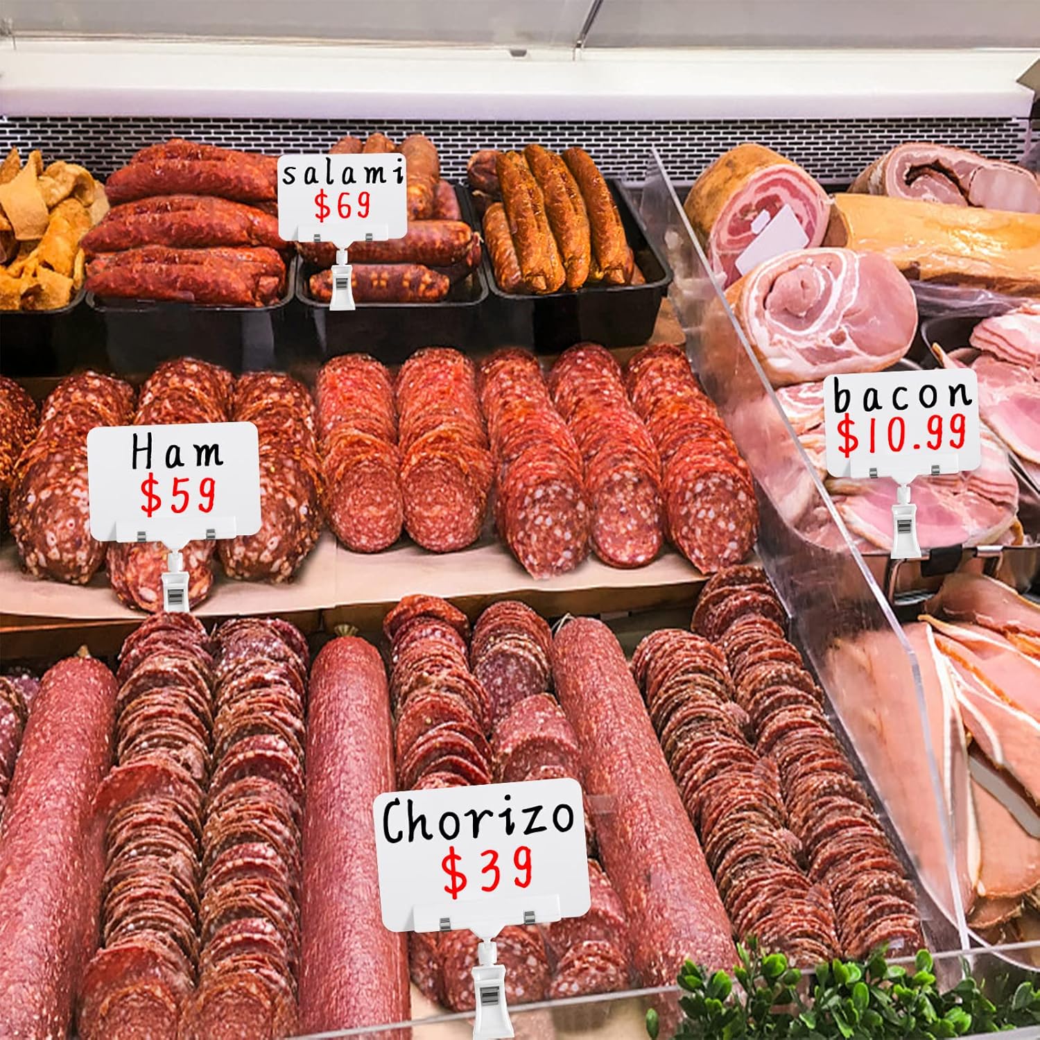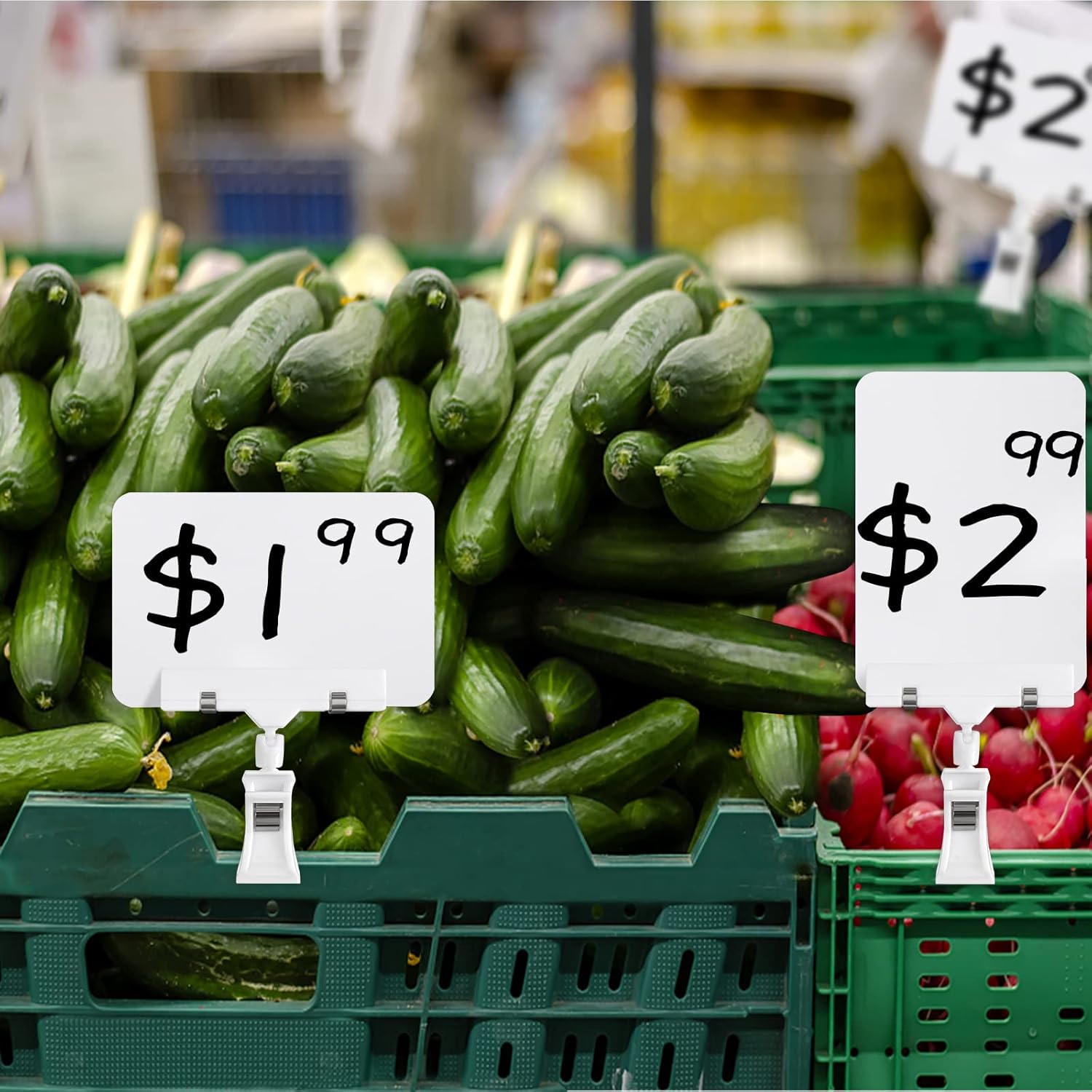 - Merchandise Display Sign Clips: You will get 8 sets price display signs with clip, and 2pcs liquid chalks. These plastic mini chalkboard signs feature with smooth surface and is easy to write and can be reusable. Pop clips-on style sign holder is suitable for supermarket, shop and more.