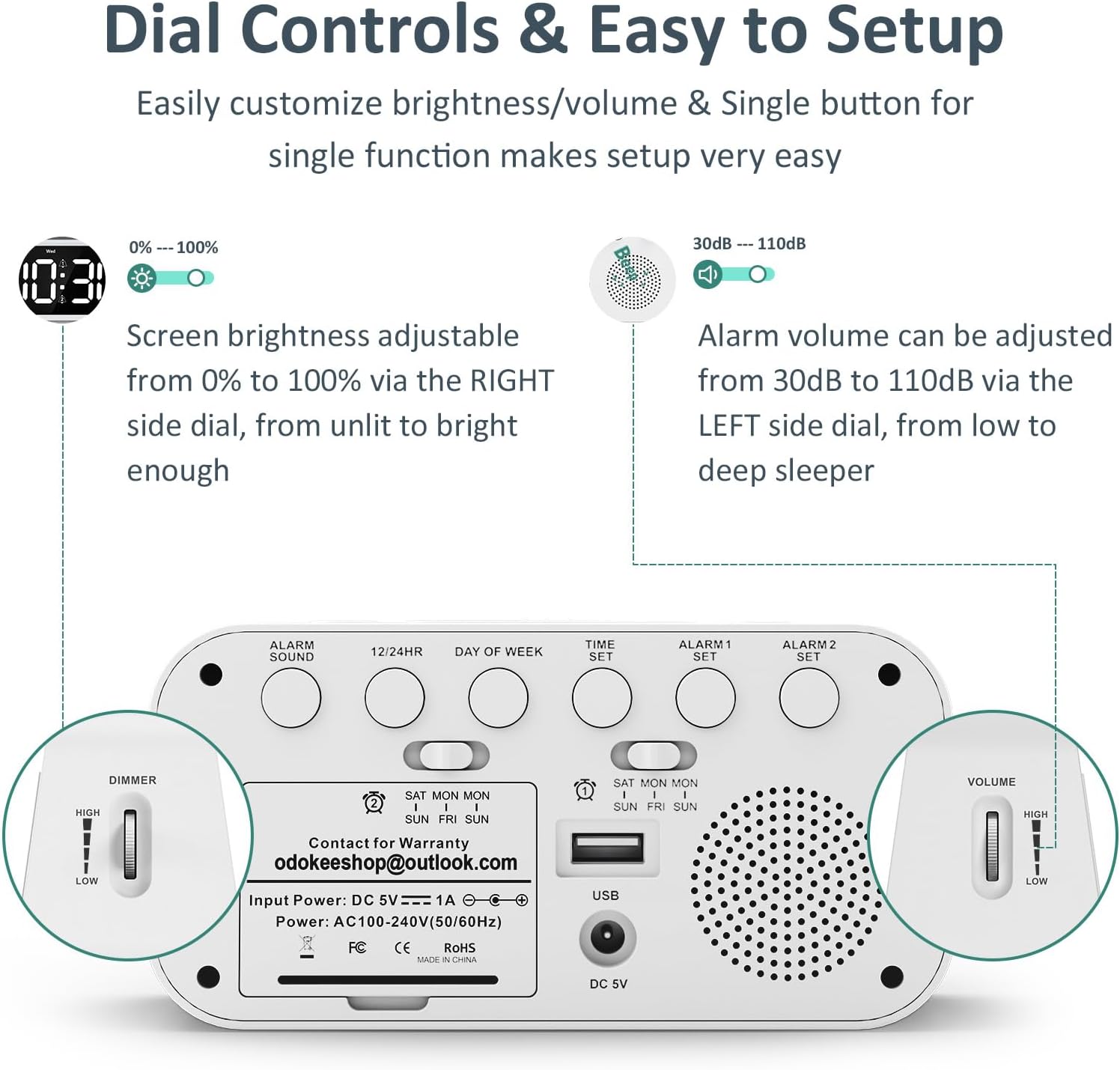 - EASY TO SETUP & 0-100% DIMMABLE DISPLAY - All buttons do one task and are clearly labeled makes setting the time or alarm extremely intuitive and straightforward. Large easy to read white LED digits(1.6-inch tall) that can be easily viewed from a distance and the brightness can be easily adjusted from very bright to fully dark with the simple dimmer dial, which is nice for sleeping so you don't have a bright light in the room. 12 or 24 hour time display optional.
