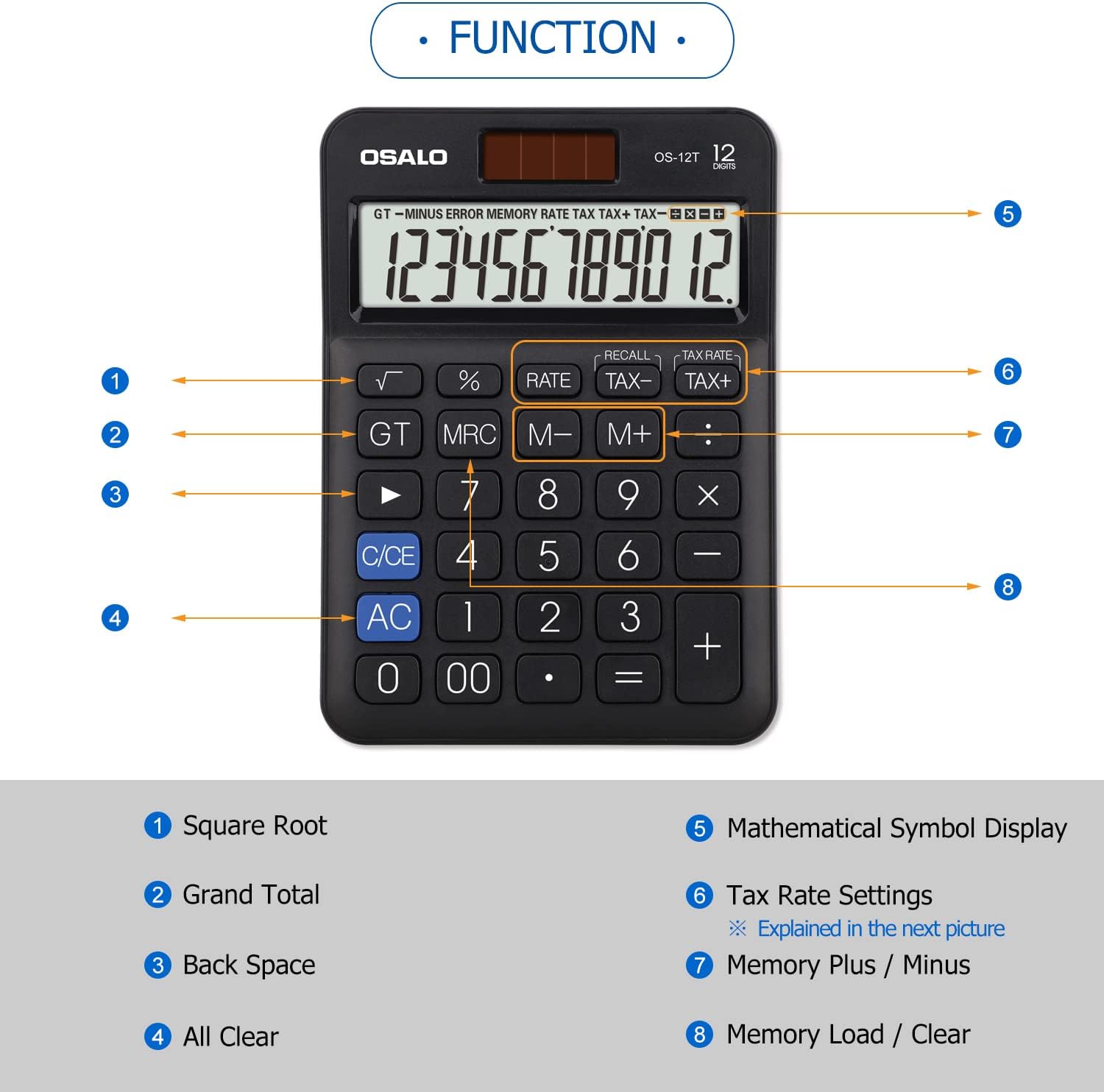 Pocket Small Size Desk Calculator, 12 Digit Large LCD Display, Basic Tax Function Handheld Desktop Calculator with Solar Battery Dual Power, Perfect for Office, School, Business OS-12T (Black)