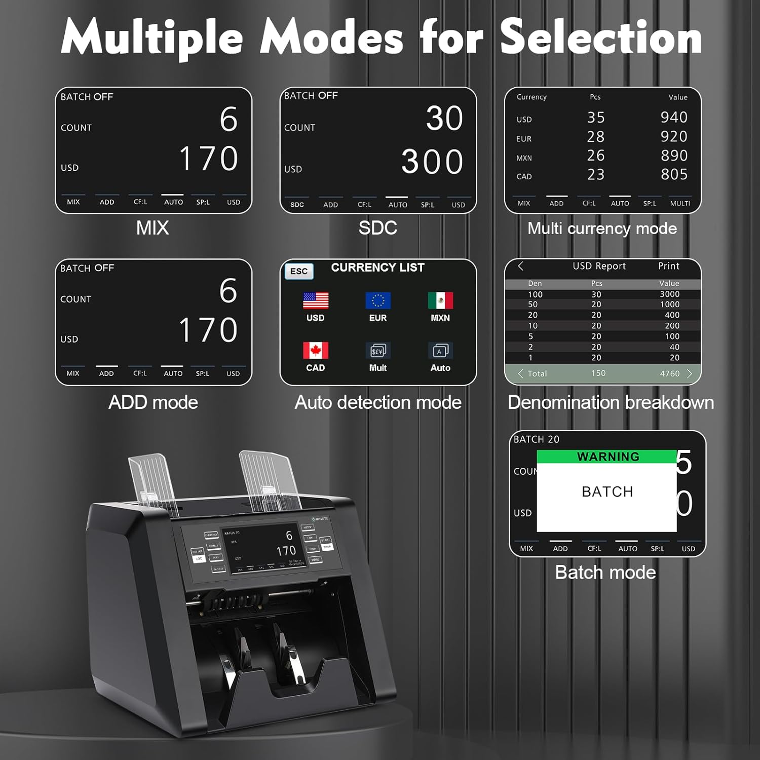 - ✅ Multi Currency&Multiple Working Modes: Designed for North American market and supports multi-currency value counting(USD/EUR/MXN/CAD). Works under different counting modes to meet your demand: SORT, MIX, Auto currency detect, Multi Currency Mix Count, ADD & BATCH. Ideal for small business, gas station, stores, restaurants.