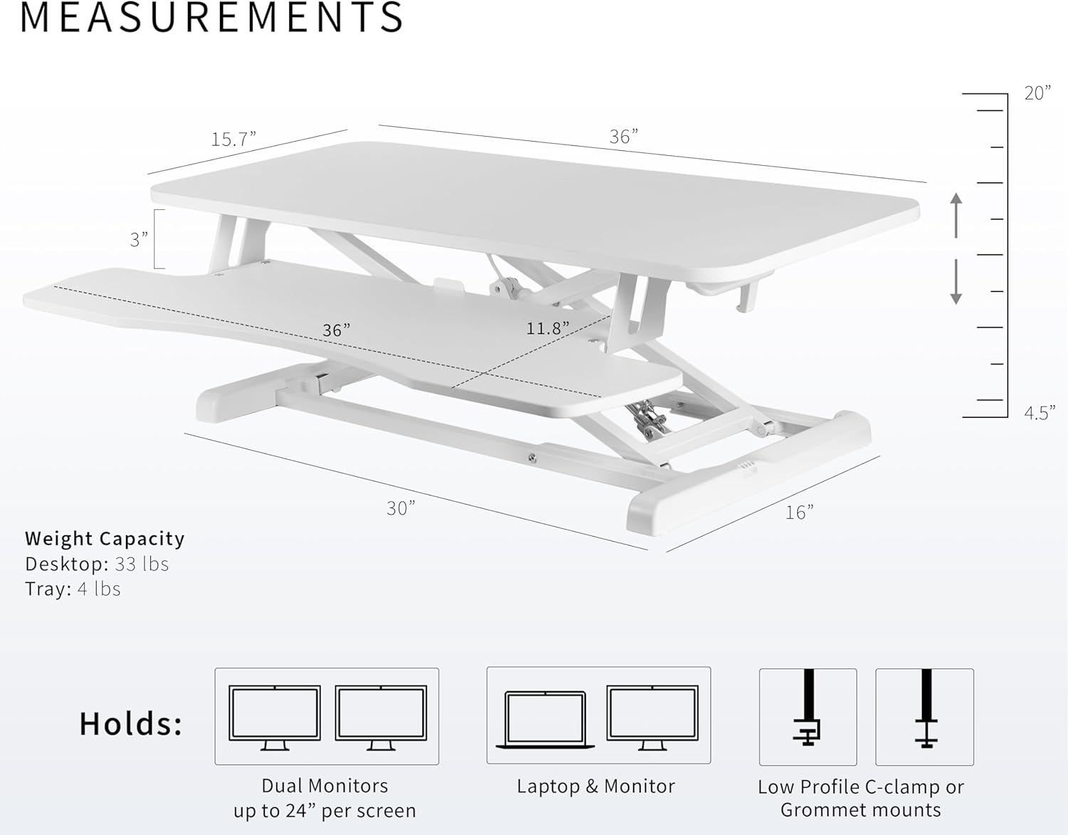 - Spacious 36” Surface: The top surface measures 36” x 15.7”, providing plenty of room for dual monitor and laptop setups. The 36” x 11.8” (10.2” in center) keyboard tray raises in sync with the top surface to create a comfortable workstation