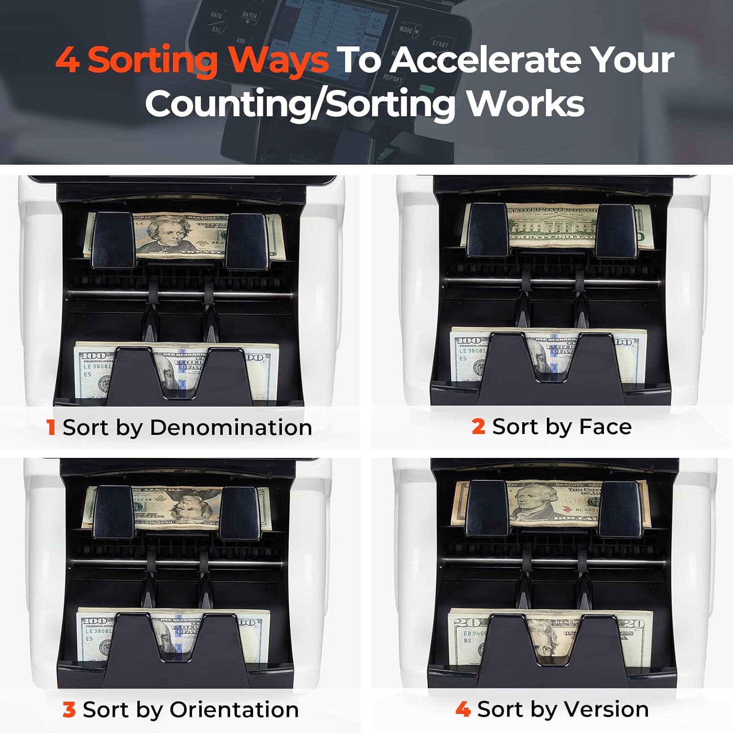 - ✅[Not Just Count, also Sort] MUNBYN 2024 Newest Mixed Denomination Money Counter Machine counts mixed bills, and reports the total value/breakdown. With a 2-pocket design, it can also sort the bills by Denomination/Face/Orientation/Currency/Version. Easily sort out a large amount of mixed bills into bundles of $1, $2, $5, $20, $50, $100. Ideal for big cash flow business weekly bank deposit.