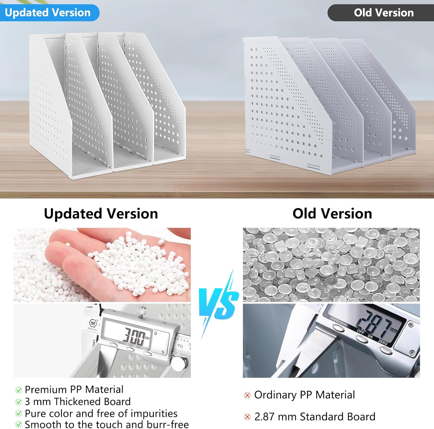- STURDY AND DURABLE: The stand book organizer is made of premium PP material with 3 mm thickened dividers, strong and stable structure, strong load-bearing capacity. The surface of the file sorter is flat and smooth without hurting your hands. Each slot is 3 inches.