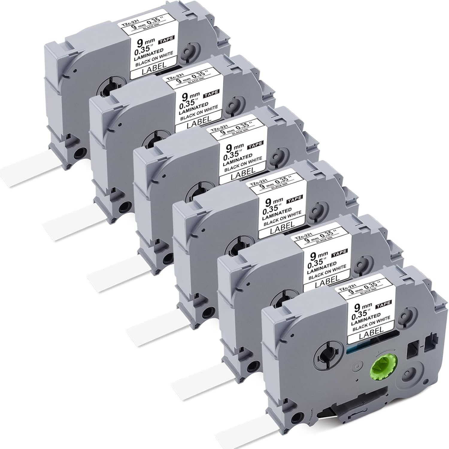 Tze-221 TZe221 Compatible for Brother P Touch TZ Tape 9mm 0.35 Laminated White Tape TZ-221 Label Tape for Brother Ptouch Label Maker PT-D200 PT-D400 PT-D600 PT-H110, Black on White, 6-Pack