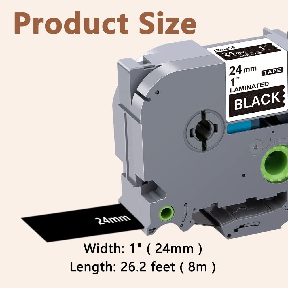 - Product features : Split back, water resistant, fading resistant, abrasion resistant, temperature resistant, strong adhesive. This compatibel label tape 24mm TZe-355 White on Black is suitable for indoor and outdoor use