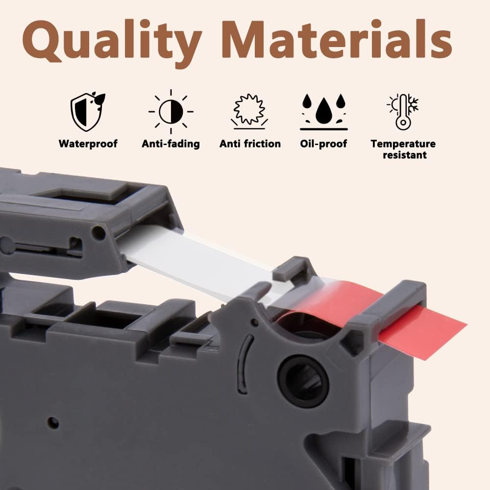 - Product features : Split back, water resistant, fading resistant, abrasion resistant, temperature resistant, strong adhesive. This compatibel 12mm tze-435 White on Red label tape is suitable for indoor and outdoor use