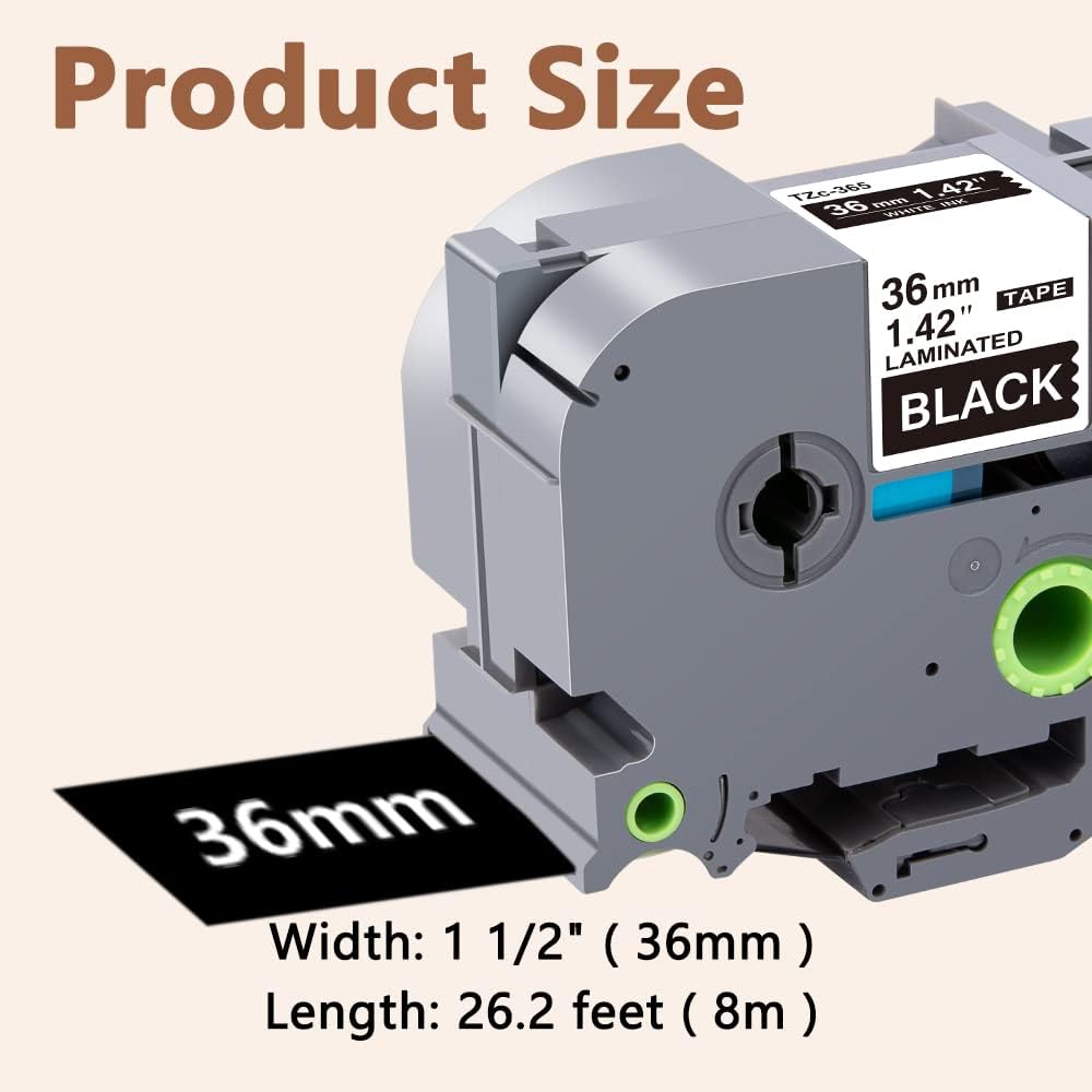 - Product features : Split back, water resistant, fading resistant, abrasion resistant, temperature resistant, strong adhesive. This compatibel label tape 36mm TZe-365 White on Black is suitable for indoor and outdoor use