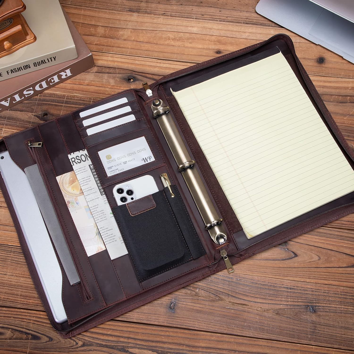 - Efficient Interior Organization: Features 4 card slots, a convenient cell phone holder, 1 pen slot, and 2 file sleeves. Each element is meticulously designed to keep your essentials neatly arranged, ensuring easy access and quick retrieval during important meetings or business events. Experience unparalleled efficiency with our thoughtfully crafted interior layout.