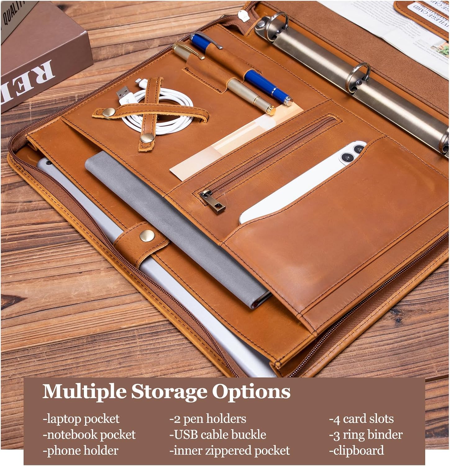 - Effortless Organization: Stay impeccably organized with 4 card slots, 1 clear card slot, and 2 pen slots for your business cards and writing instruments. The built-in cell phone holder keeps your phone accessible yet secure. Utilize the small inside YKK zippered pocket for confidential items, and keep your USB cables tangle-free with the dedicated USB cable holder.