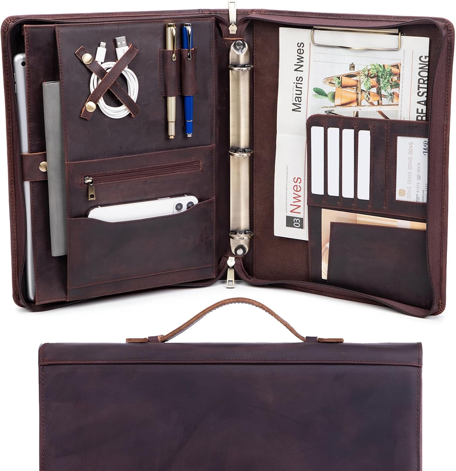 Genuine Leather Portfolio 3 Ring Binder with Clipboard, Hidden Handle, 8.5 x 11 Zippered Padfolio, Business Organizer Professional Executive Folio for Men and Women, Dark Brown