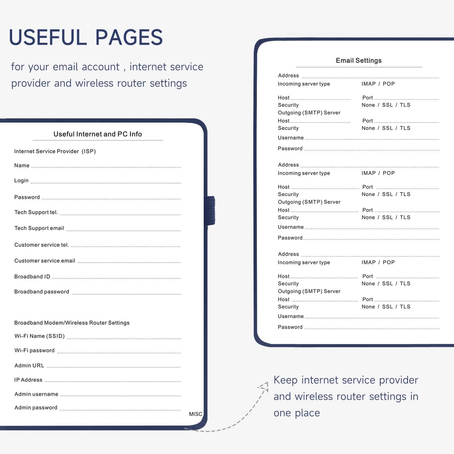 - All-In-One Password Book & More - This password organizer has space to store all the information you may need when you surf the web, including software license information, email settings, wireless router settings, and notes section.