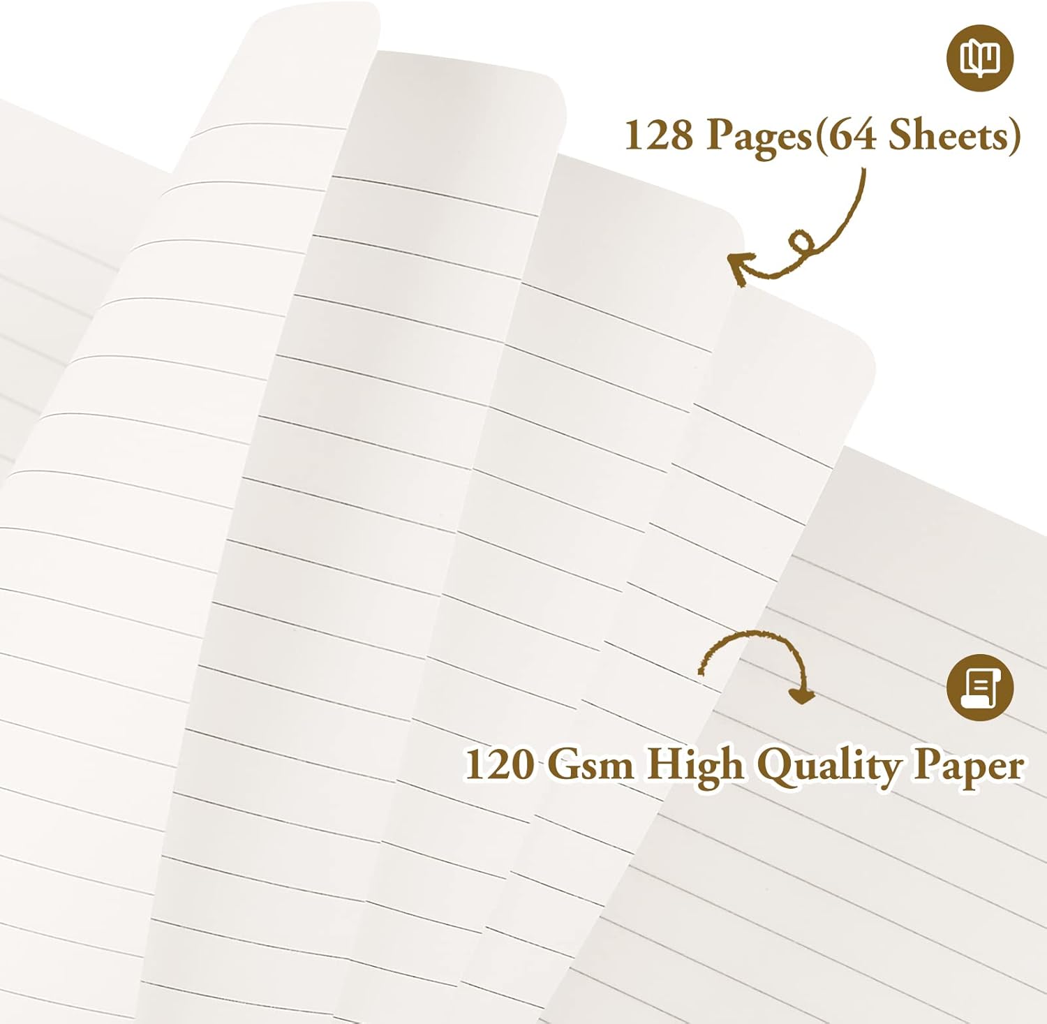 - Hardcover Lined Notebook: Professional sturdy faux leather notebook journals. Faux leather feels soft and smooth, will protect your journal to last for years, the pages are thick and cut evenly, minimal ghosting / bleeding. Easy to lay out flat for comfortable writing and reading.