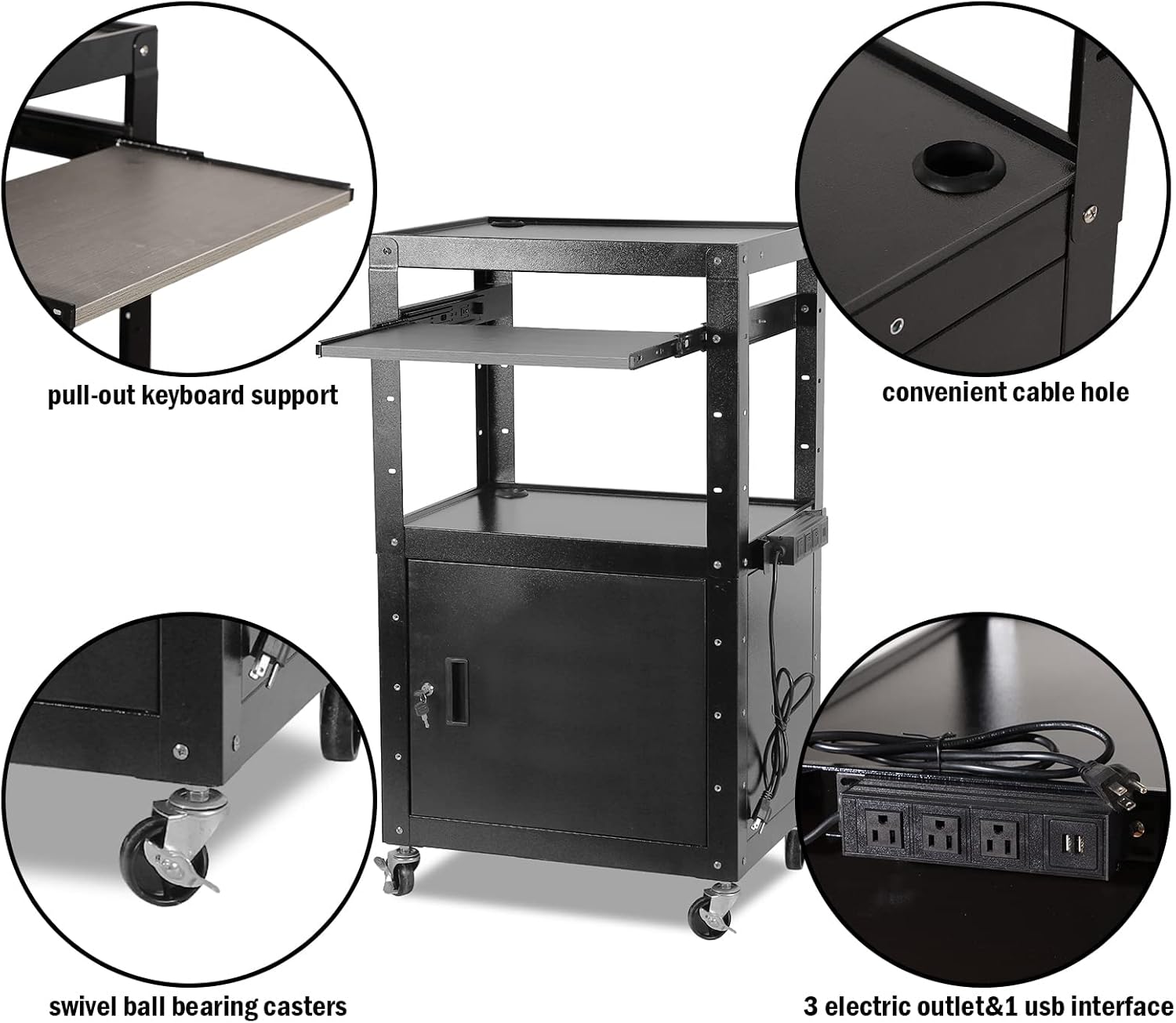AV Carts, Rolling Presentation Cart Station, Height Adjustable Media Cart for Video Projector, TV, Printers, Computers with 1 Storage Locking Cabinet, 1 Sliding Keyboard Tray, 3 Outlets, 2 USB Ports