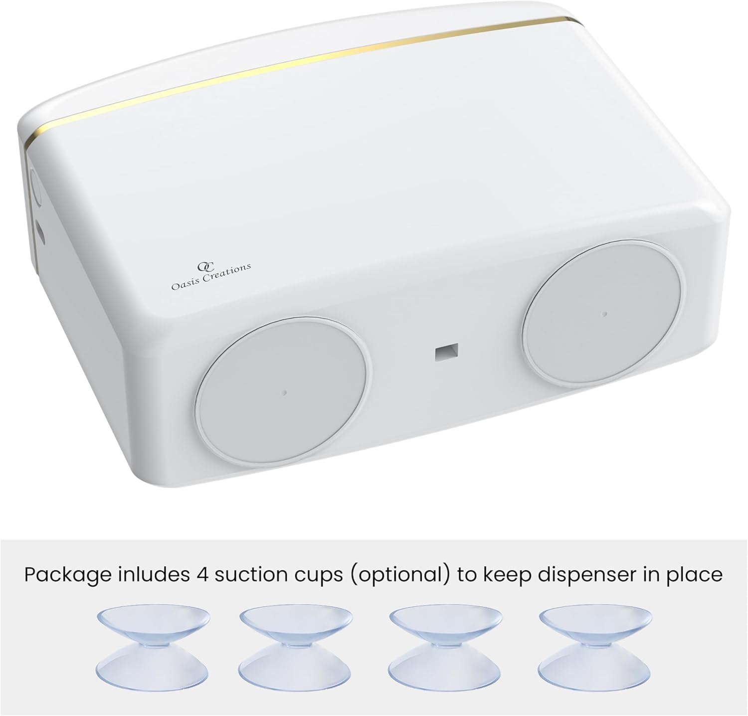 - SUCTION CUPS INCLUDED: 4 suction cups included (optional to use) to keep dispenser in place. This dispenser features a glossy white color and a sleek gold trim around the top. It has soft round edges and an eye catching high gloss coating. It’s modern, stylish, and such a necessity!