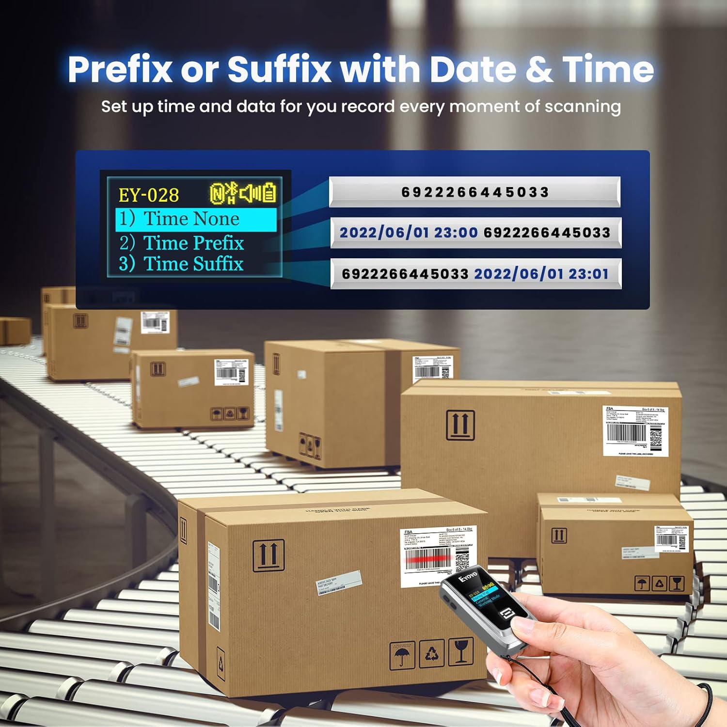 - Multiple Configuration Through the Screen Menu: Eyoyo wireless barcode scanner supports time stamp, instant upload, and storage mode, also supports turning on or off the sound and vibration, adding custom prefix/suffix digits, hiding characters, adding keyboard keys (TAB, CR&LF, etc.) to the scanning operation and so on. All these settings can be set through the menu without scanning the settings code