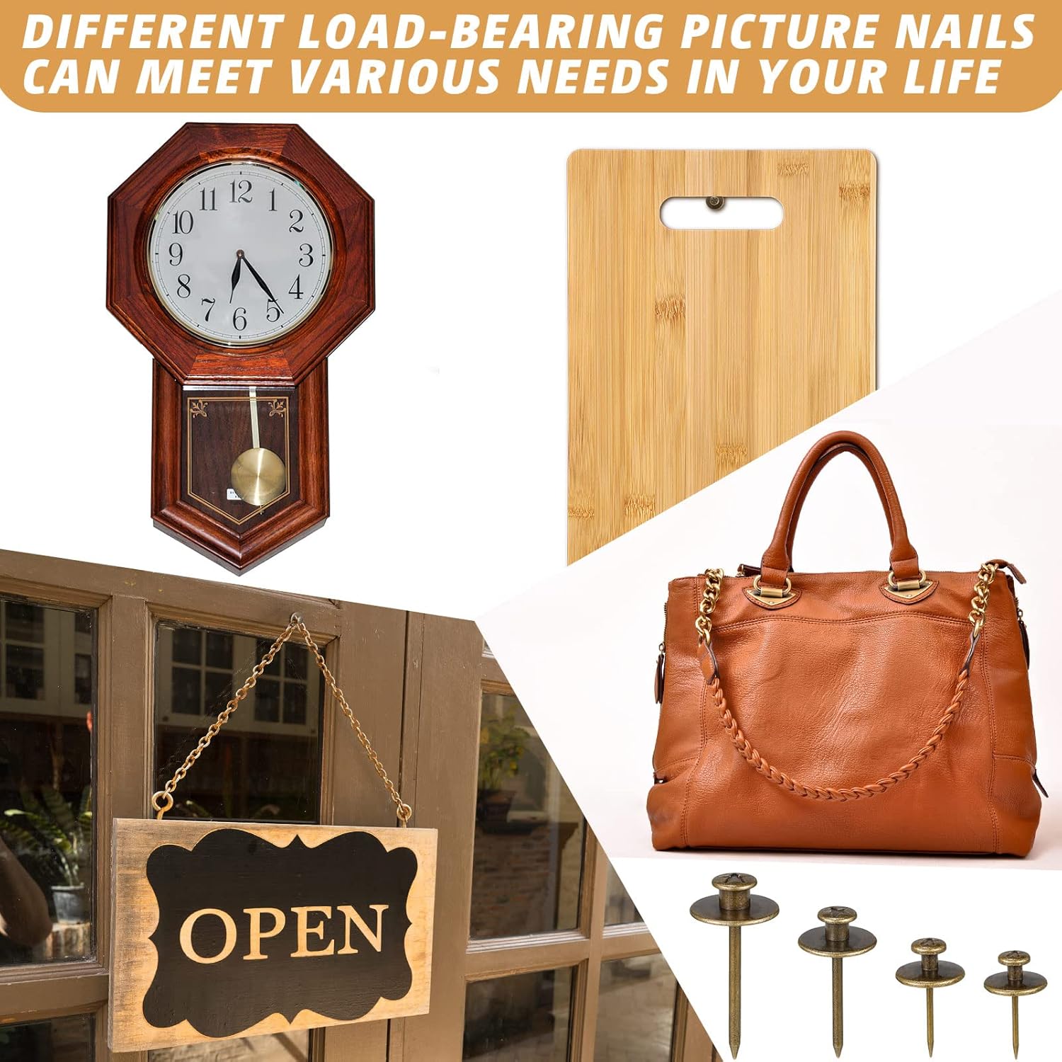 Zhengmy 40 Pcs Double Headed Picture Hangers Nails 4 Size Long Thumb Tacks Wall Nails for Hanging Pictures Decorative Push Pins Hooks for Drywall Photo Office Home Decor, 20/30/ 40/ 50lb(Bronze)