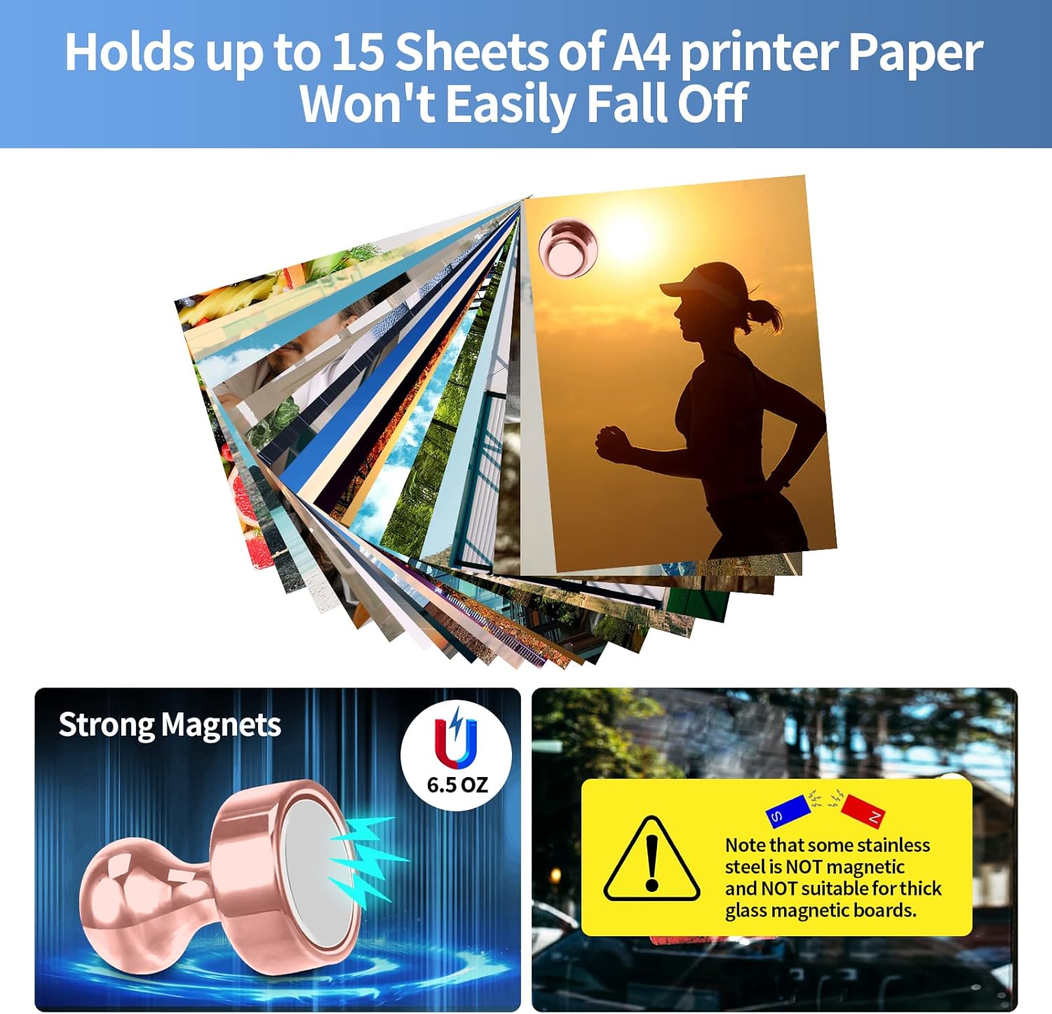 - 🌻【Strong Whiteboard Magnets】Do not be fooled by these magnets for whiteboard, They can hold up to 15 sheets of A4 printer paper at once with just a tiny magnet. Even possible to use them in the kitchen to hold cooking tools that weigh no more than 6.5 OZ and the cooking tools won't easily fall off.